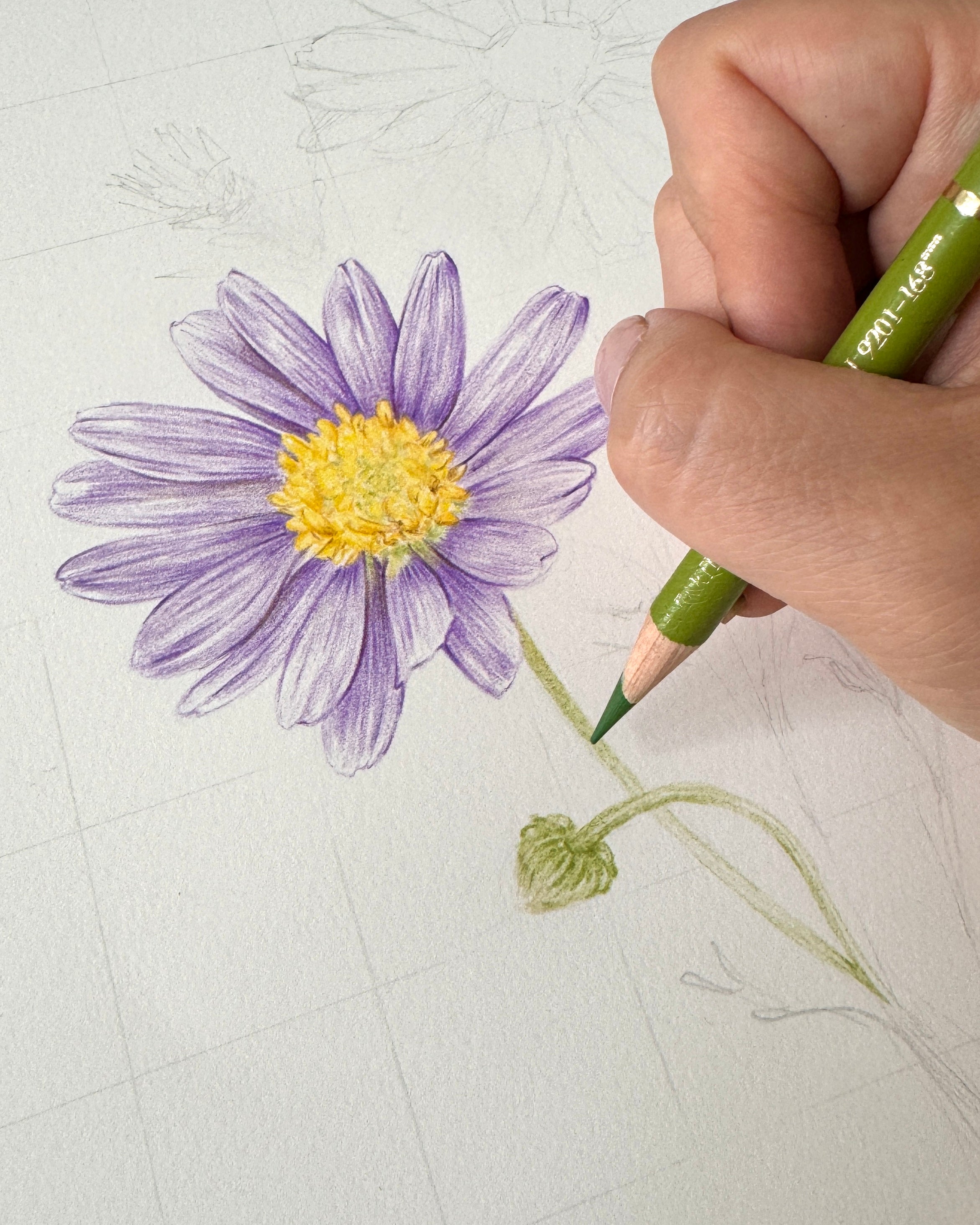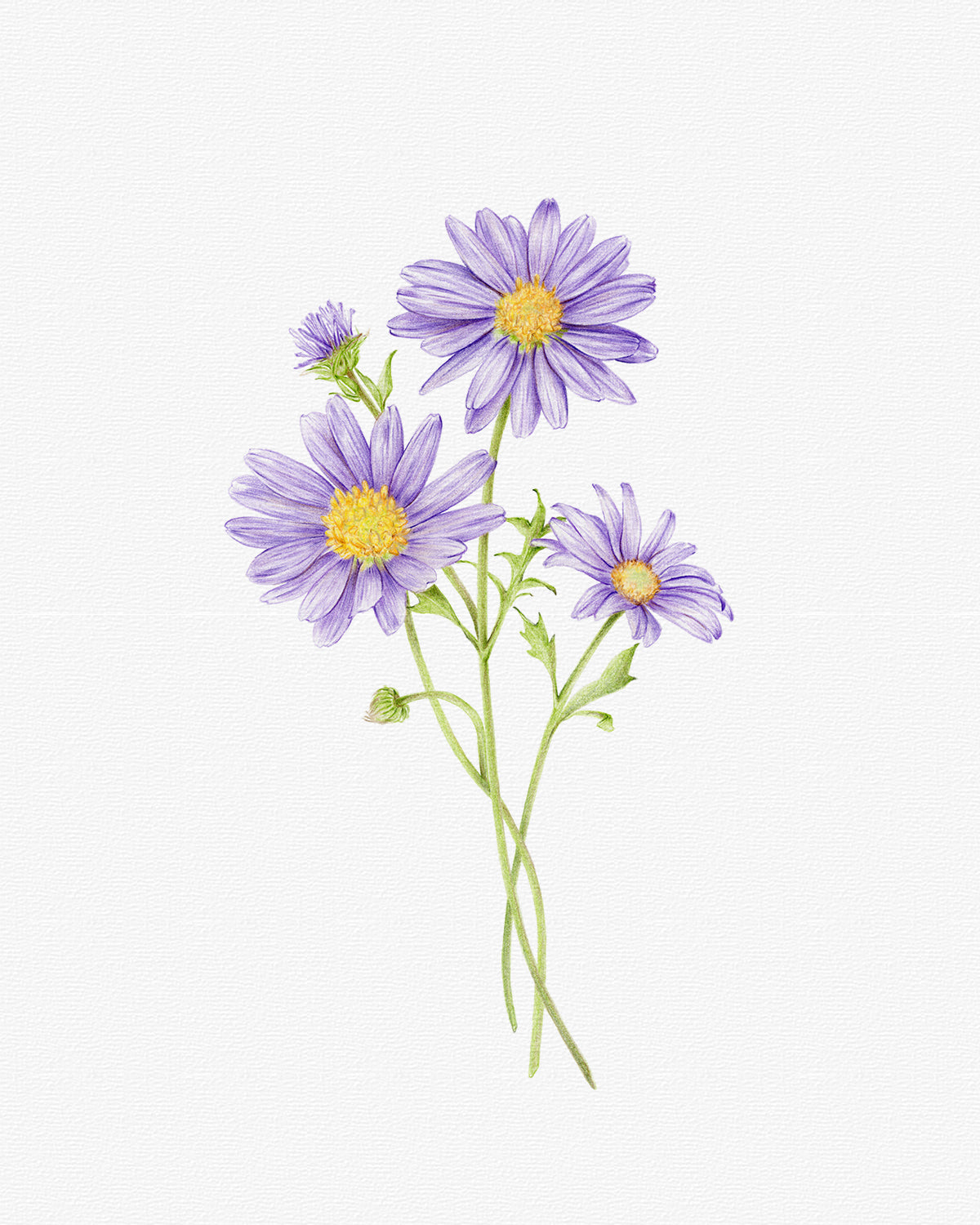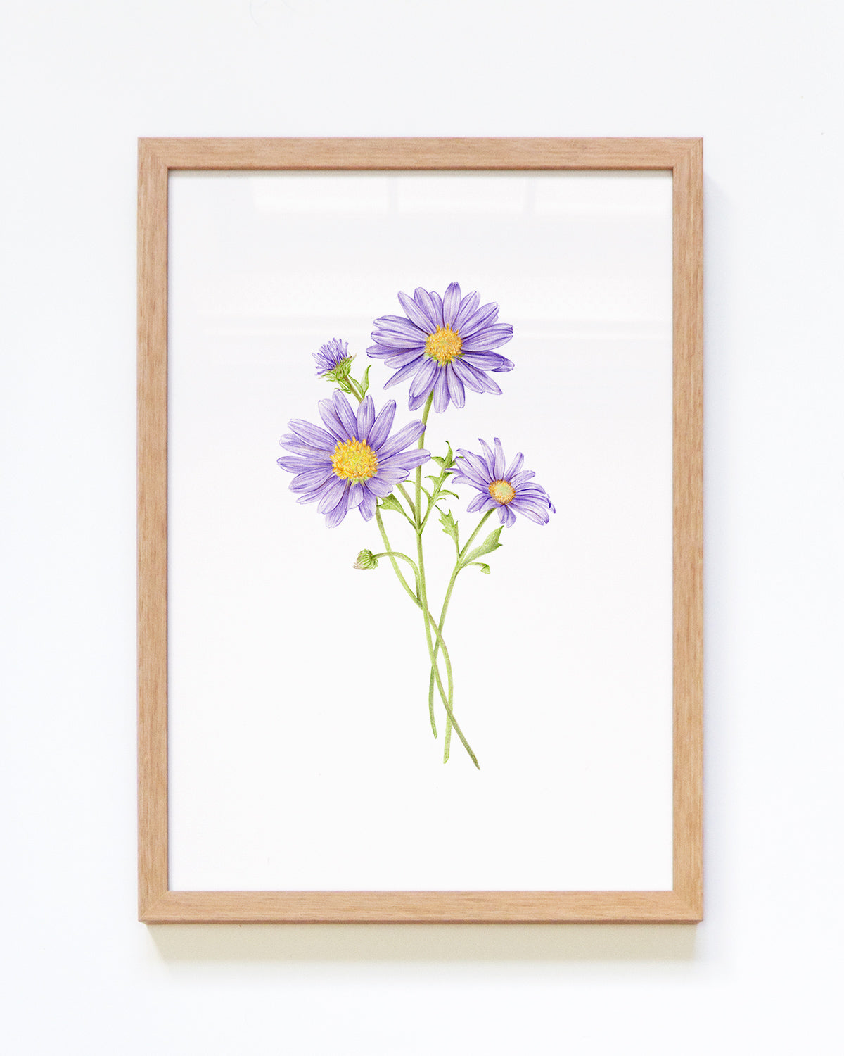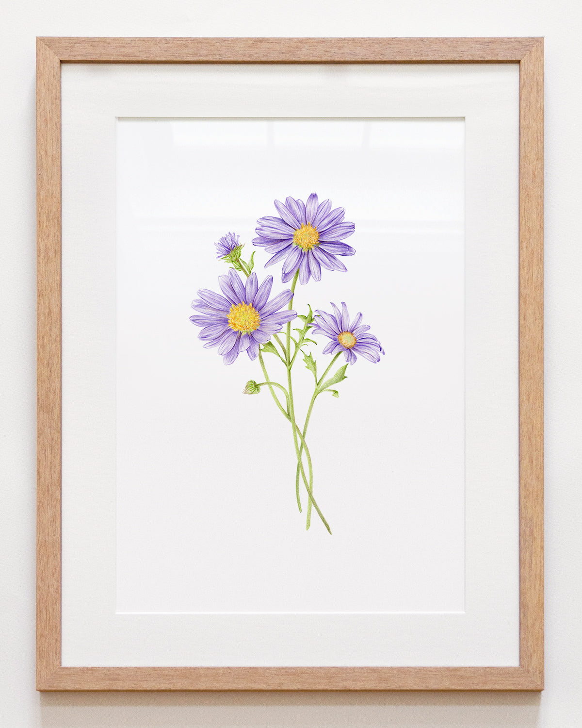 The Australian February birth flower, Brachyscome, also known as Swan River Daisy symbolises new beginnings, hope and innocence. This original drawing, crafted with coloured pencils on 300gsm hot-pressed watercolor paper, captures the essence of the vibrant native bloom.