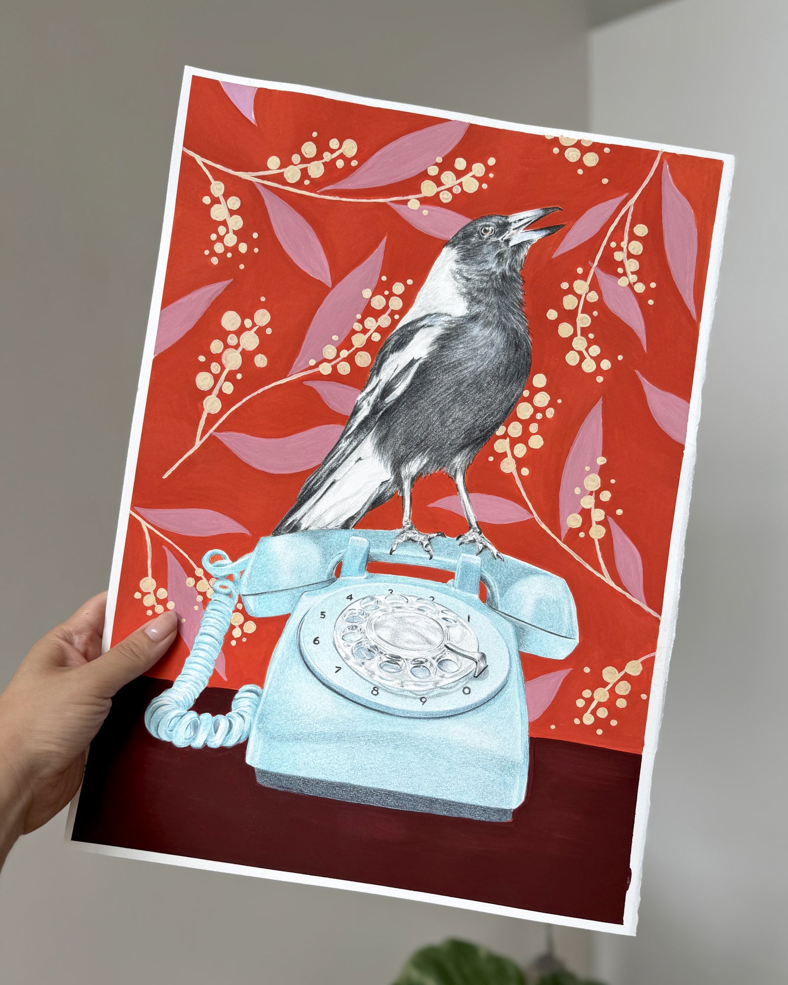 Inspired by the deep, dramatic tones of the Art Deco era, this artwork is bold yet familiar. The magpie, perched on a vintage phone, feels like a voice from the past. A reminder of forgotten conversations, distant memories, and the beauty of everyday sounds that shape our world.