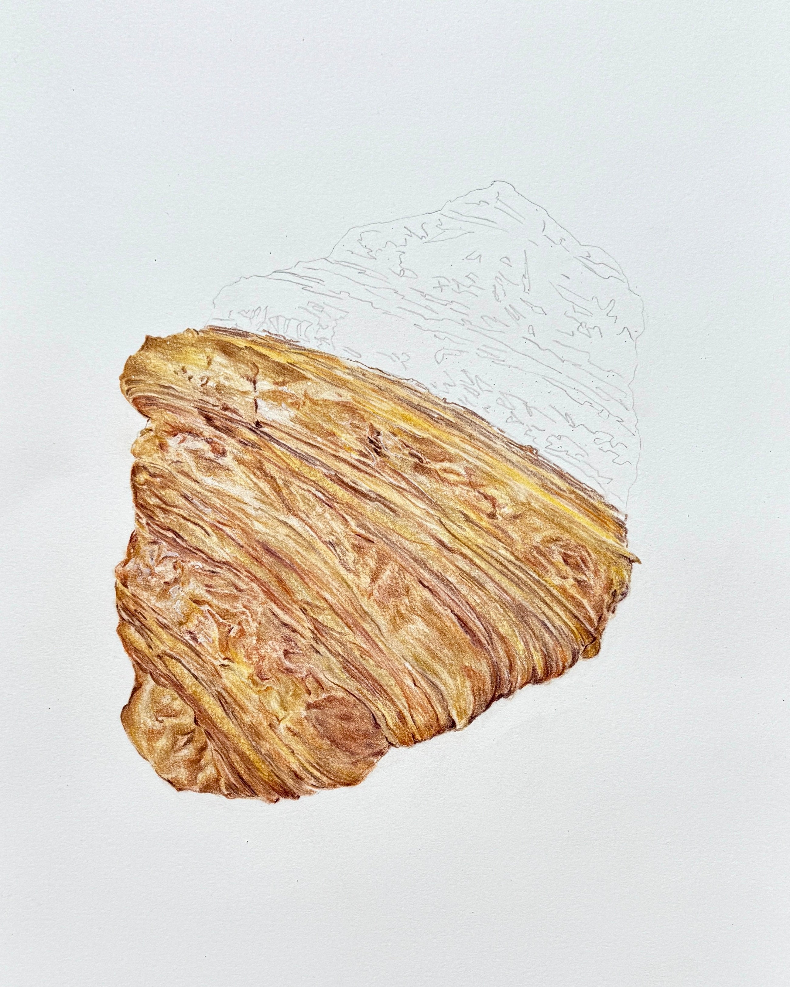 Determined to make this year one of growth and experimentation, I finally took on the challenge with pastels and coloured pencils in hand. There were moments of doubt (just like when you wonder if your croissant dough will actually rise), but I stuck with it, and here we are, a buttery, flaky goodness on paper.