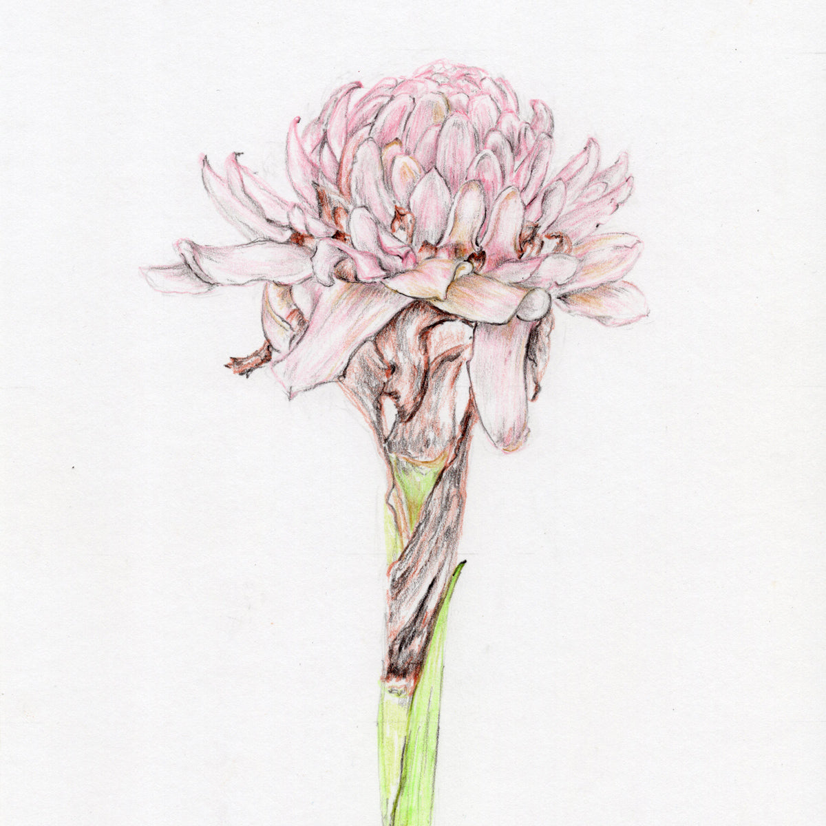 Native to Malaysia, the torch ginger is grown throughout tropical south-east Asia for the spectacular flower as well as for food. With an exotic, sweet and floral flavour, the stems of the flowers are chopped up and added to curries or soups with rice noodles. This drawing is from the 100 Days of Flowers projected completed in 2015.