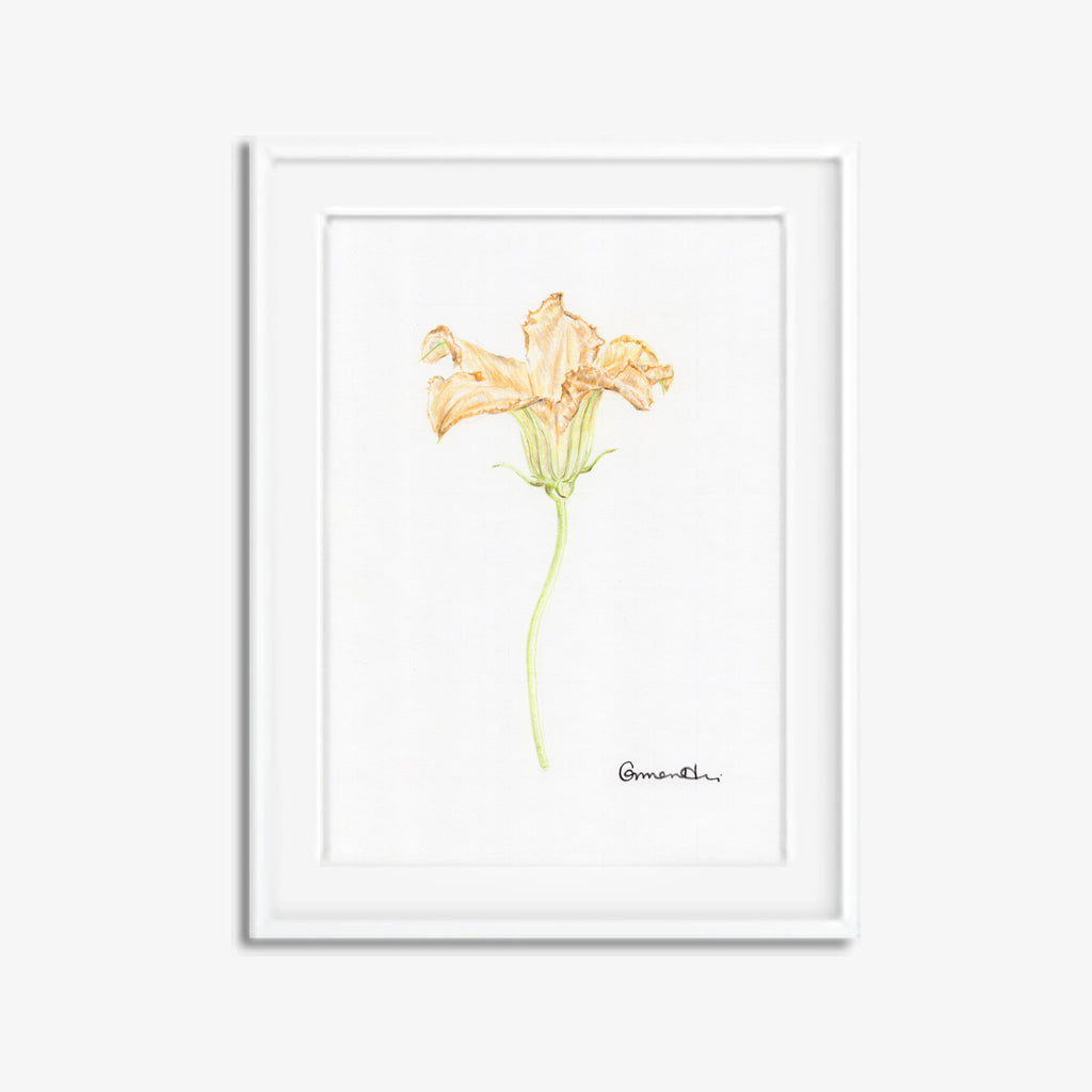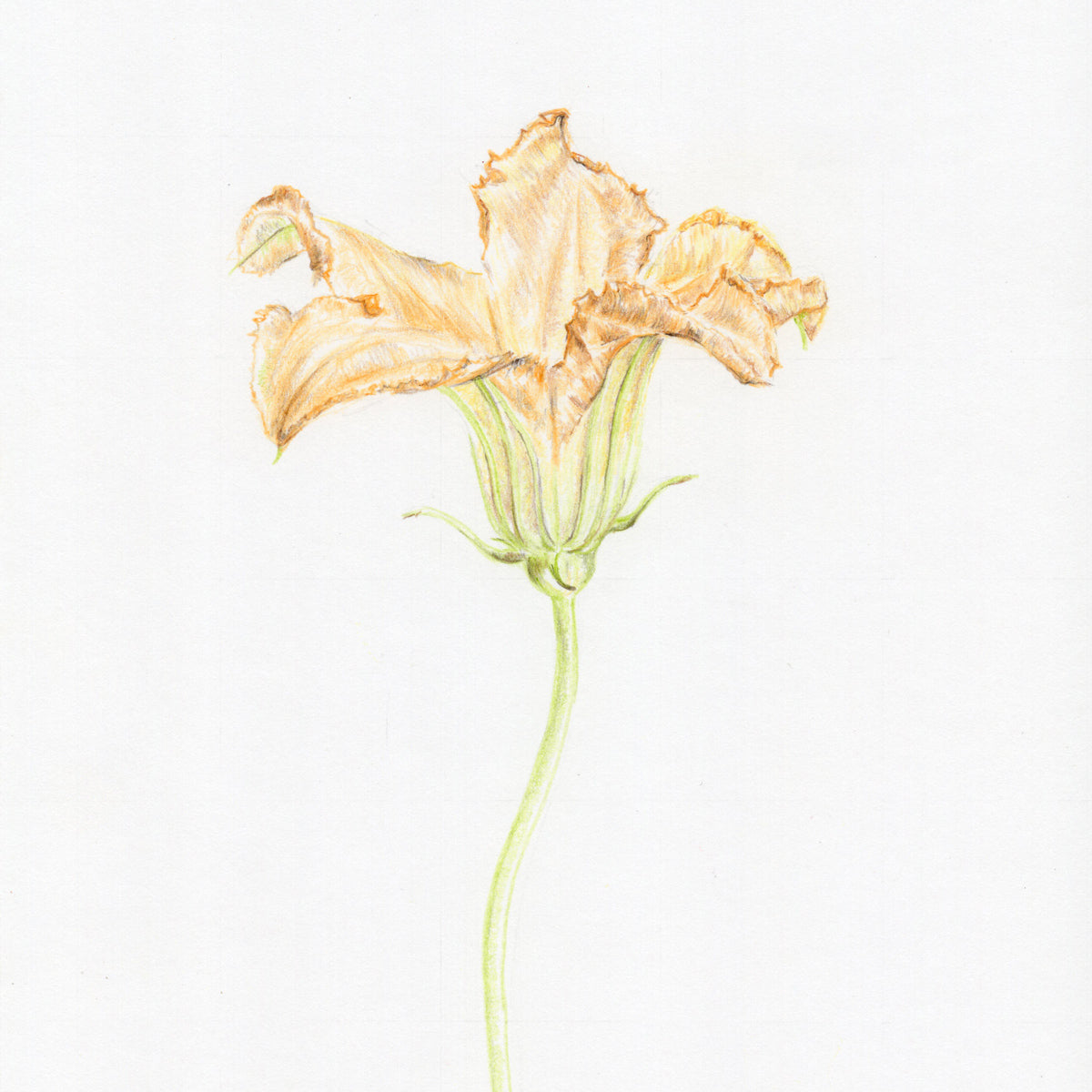 The female and male zucchini flower are slightly different in appearance. The female flower is a golden blossom on the end of each emergent zucchini, while the male flower grows directly on the stem of the zucchini plant on a long stalk. This drawing is from the 100 Days of Flowers projected completed in 2015.