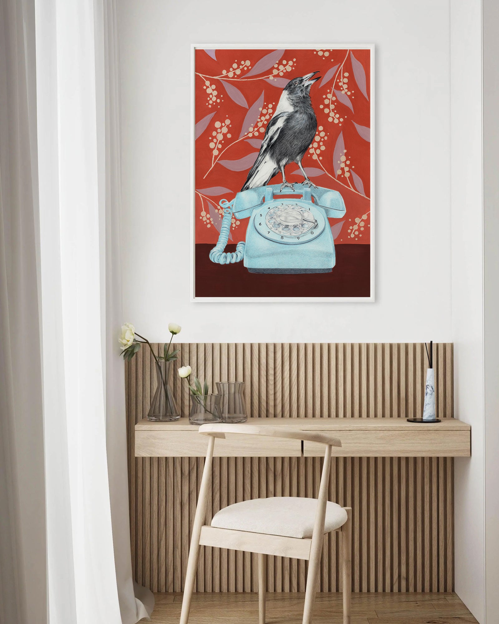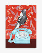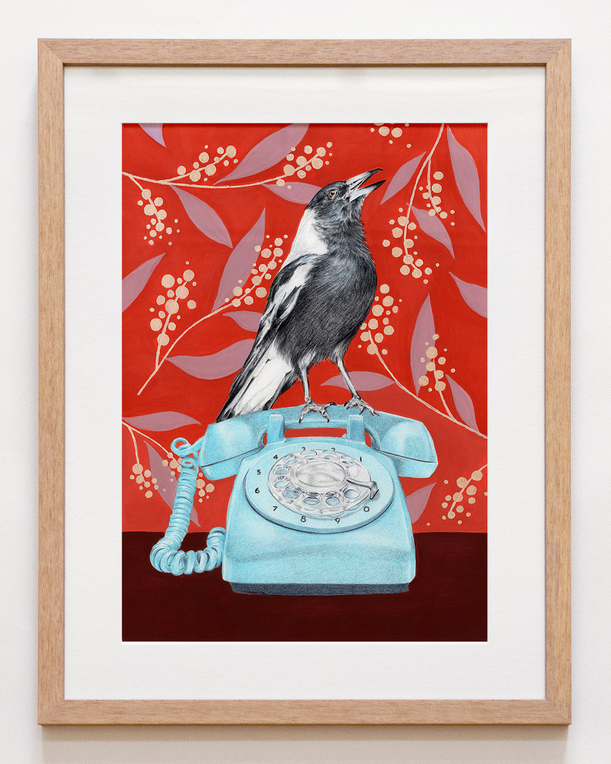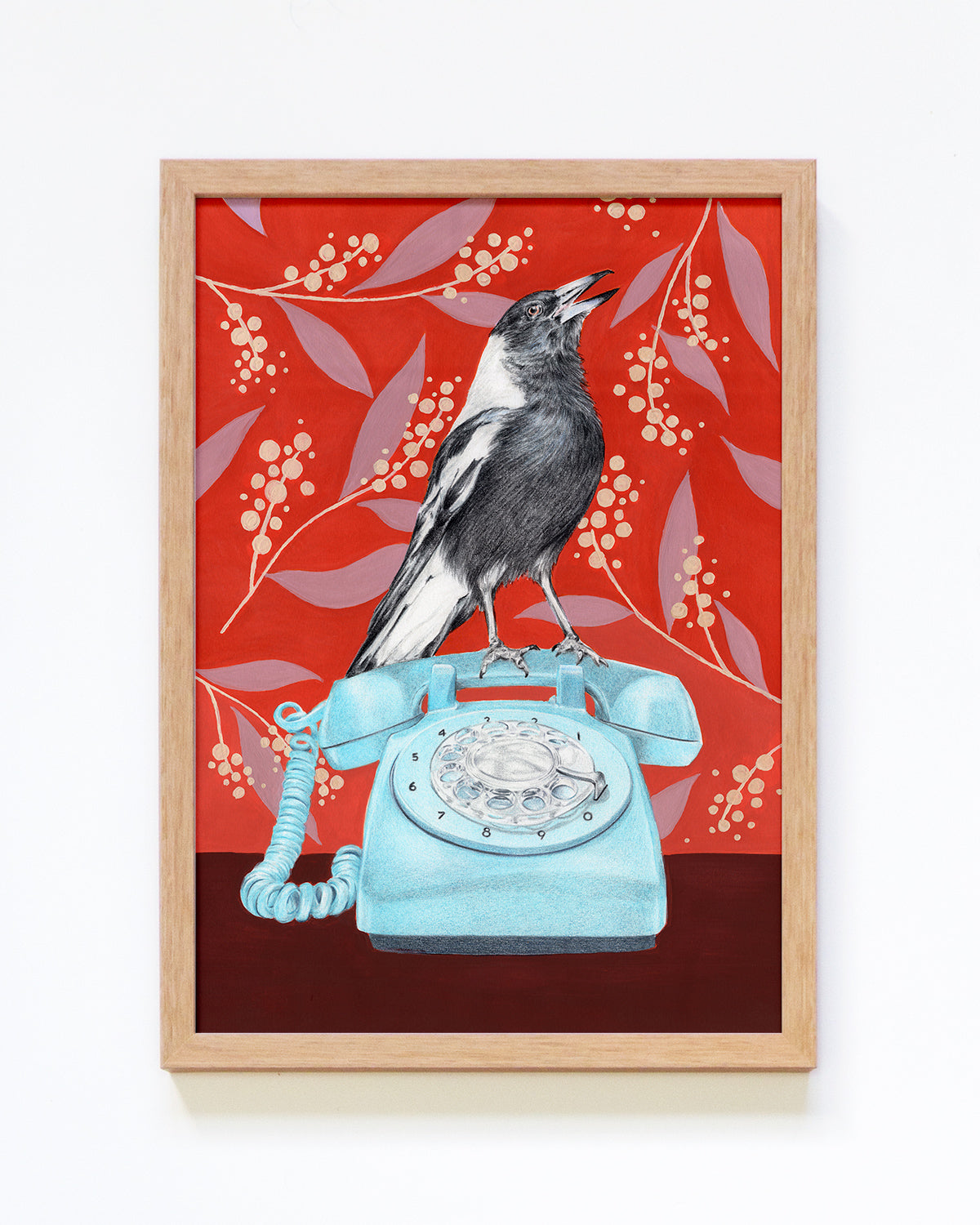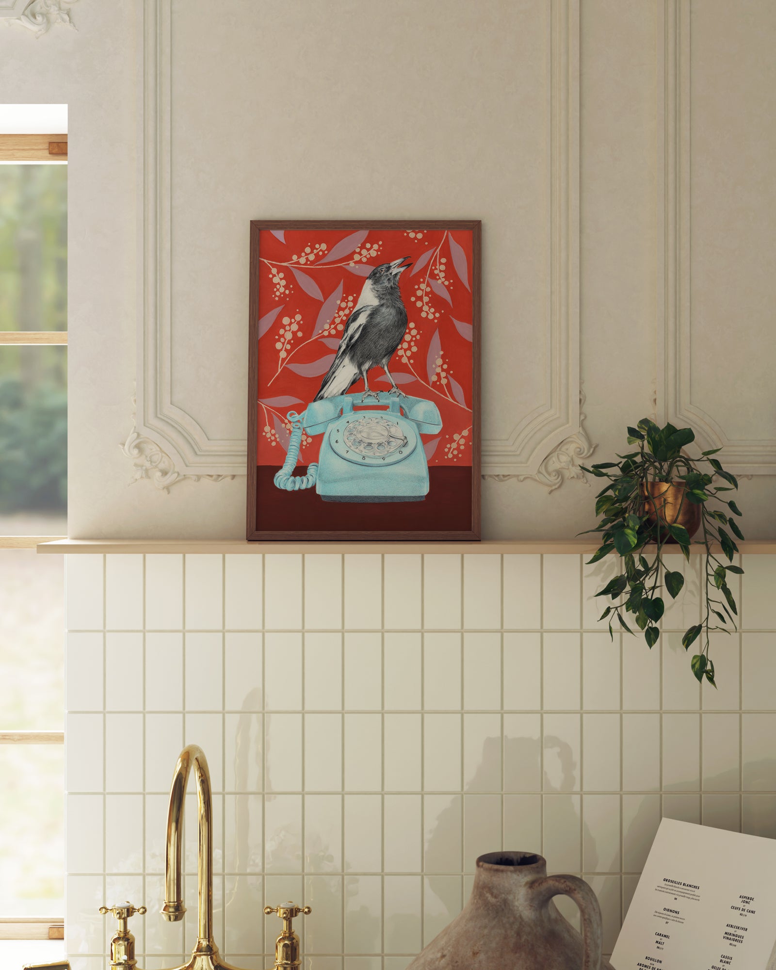 The magpie, perched on a vintage phone, feels like a messenger from another time. It reminds me of the way certain sounds, like a magpie’s warble or the ring of an old phone can transport us to another place, another memory.
