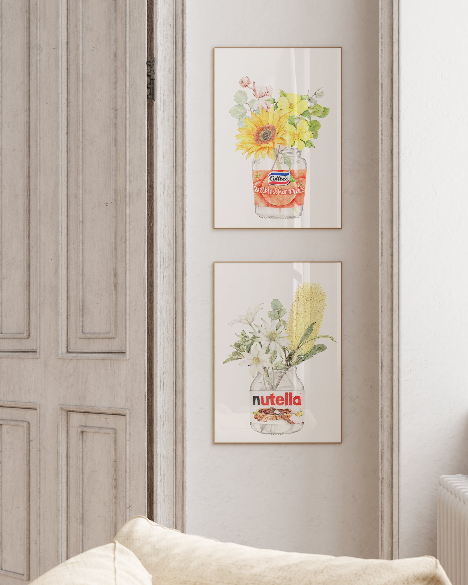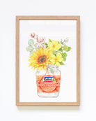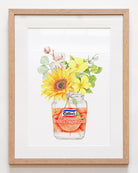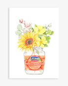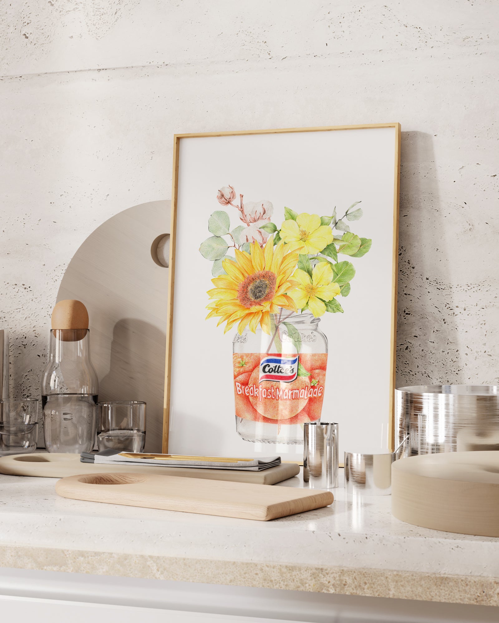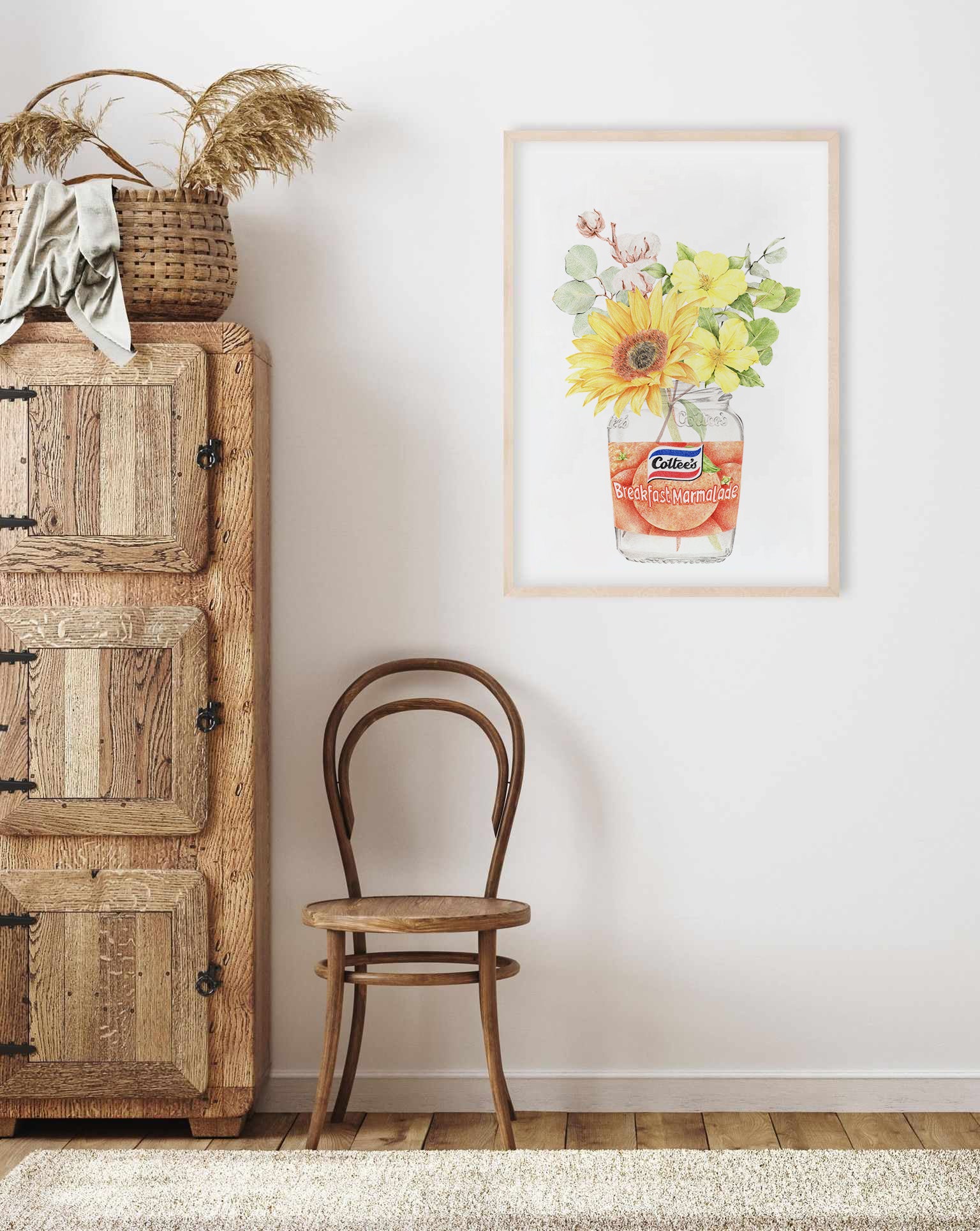 This delightful kitchen art print features a jar of marmalade, accompanied by a bouquet of sunflowers and guinea flowers, evoking memories of a perfect toast with a lashing of butter and marmalade. It's a slice of Australiana that adds a touch of joy to any morning breakfast gathering.