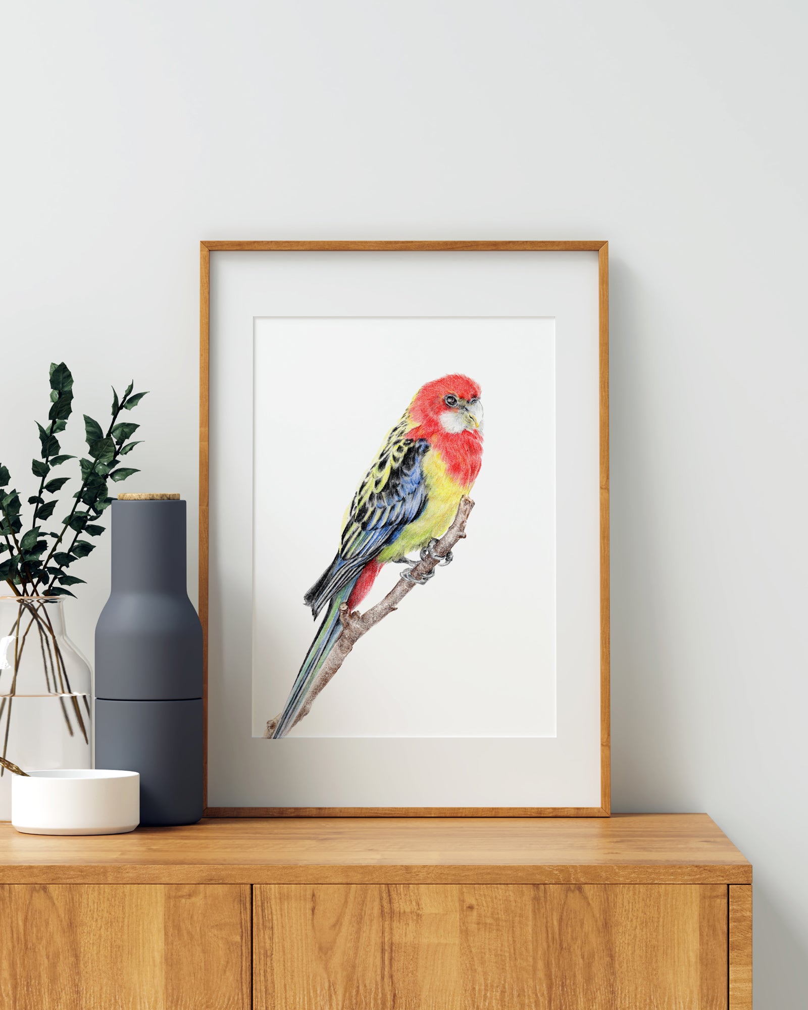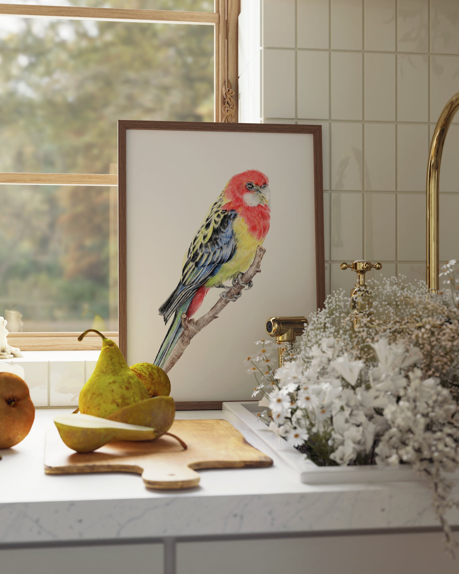 Whether it’s to brighten a living room or add a splash of colour to your gallery wall, this Eastern Rosella print is sure to make a statement.
