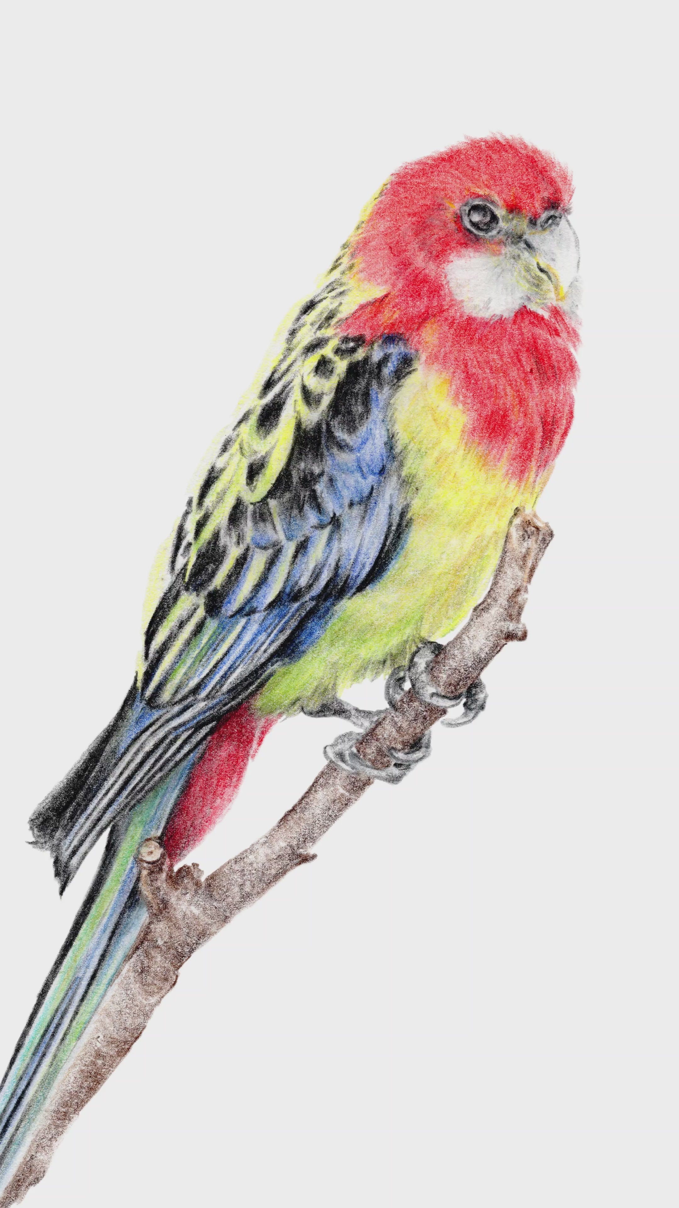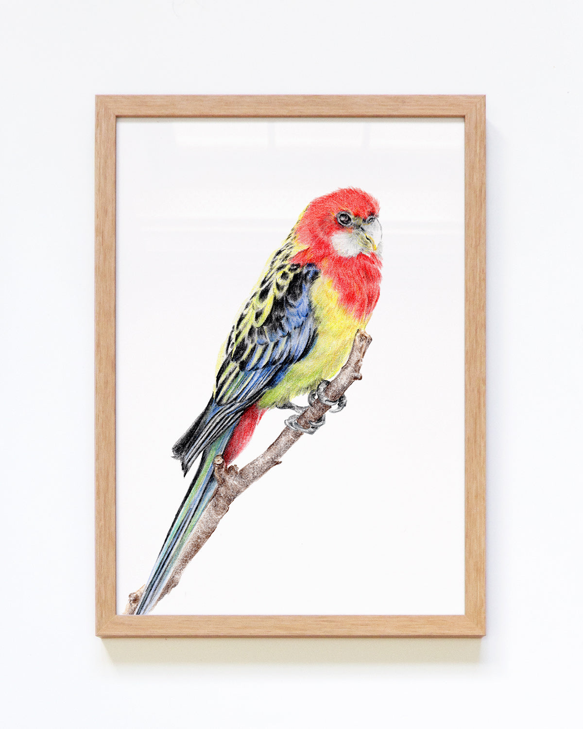 Bright, bold, and full of life, Rosalie the Eastern Rosella art print captures the beauty of one of Australia’s most colourful native birds. Originally hand drawn with coloured pencils, this print bursts with vibrant hues, showcasing the rich reds, greens, yellows, and blues that make the Eastern Rosella so iconic.