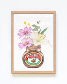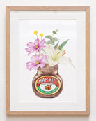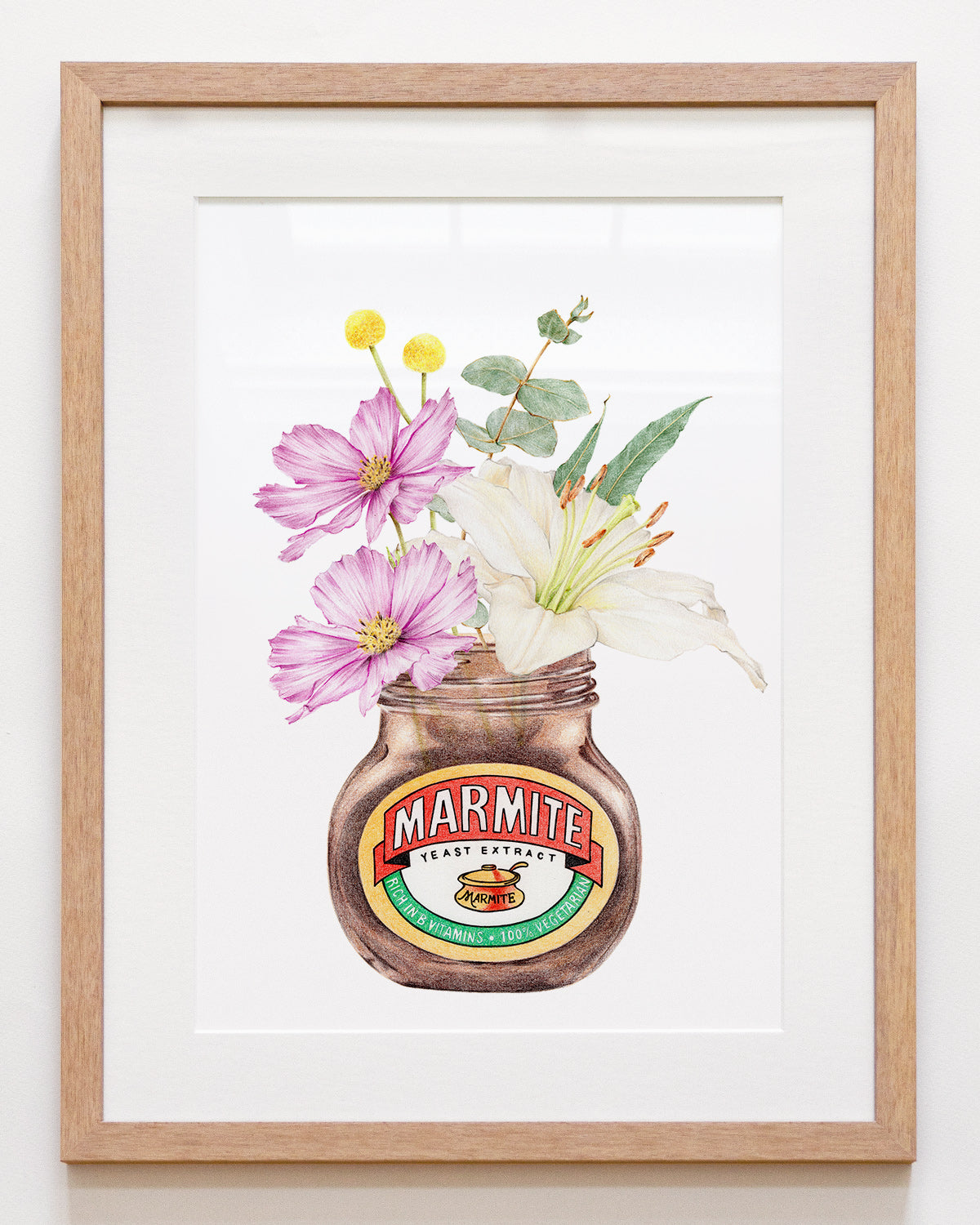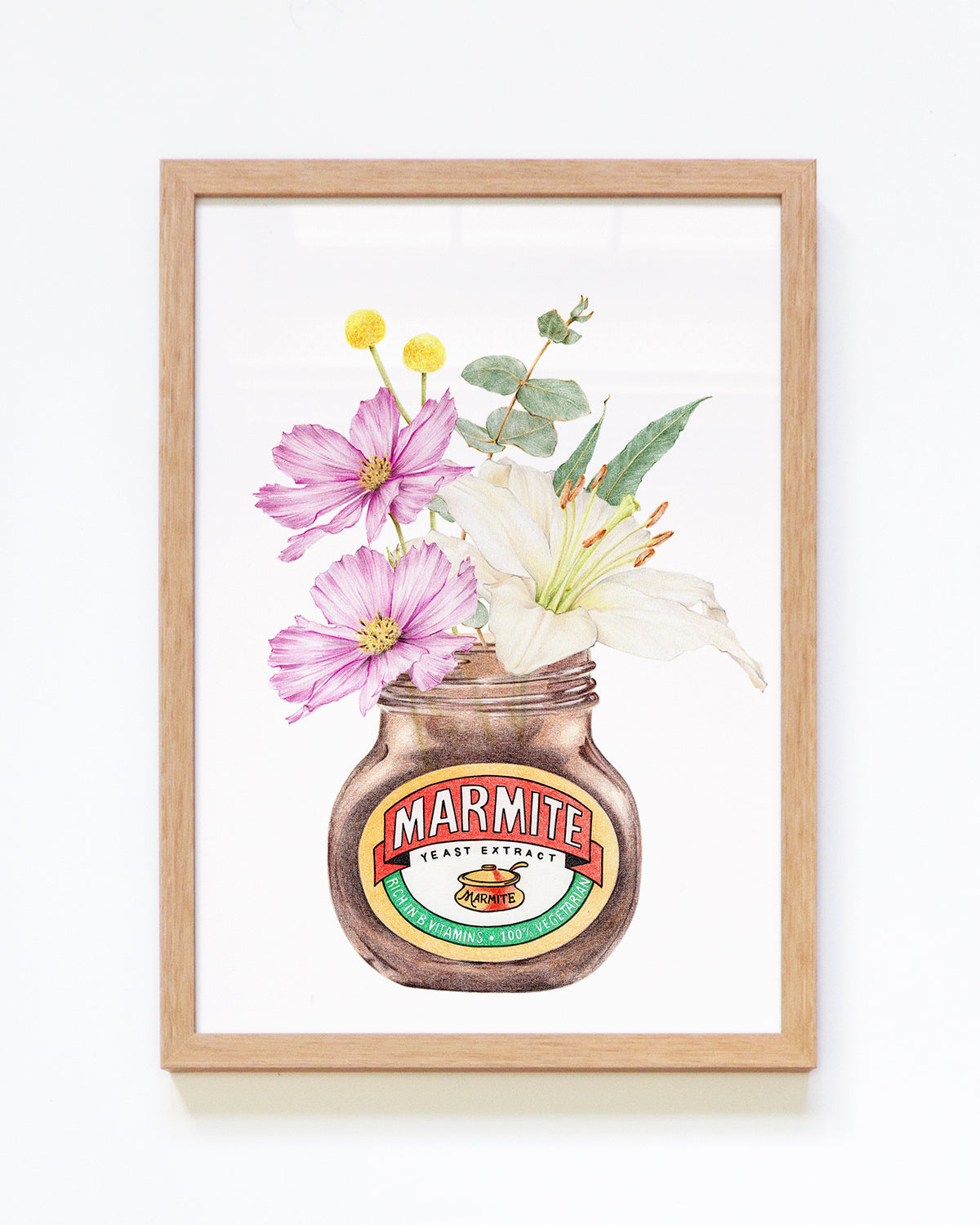 This highly requested fine art print is a love letter to those who grew up with the unmistakable taste of Marmite. Originally hand-drawn in coloured pencils by Australian artist Carmen Hui, it features a classic Marmite jar blooming with spring florals – cosmos, lily, and eucalyptus leaves – each petal capturing the essence of morning sunshine.