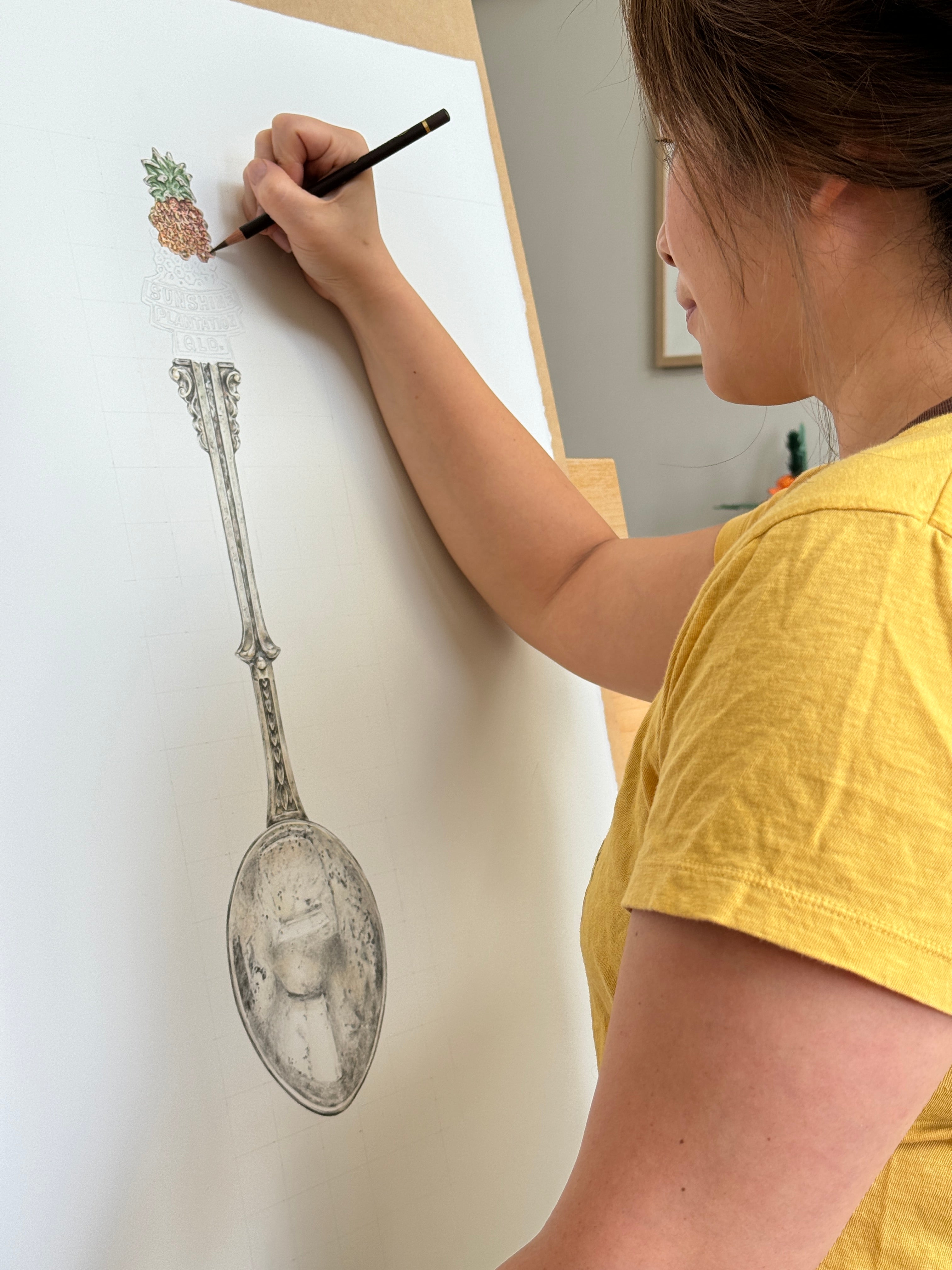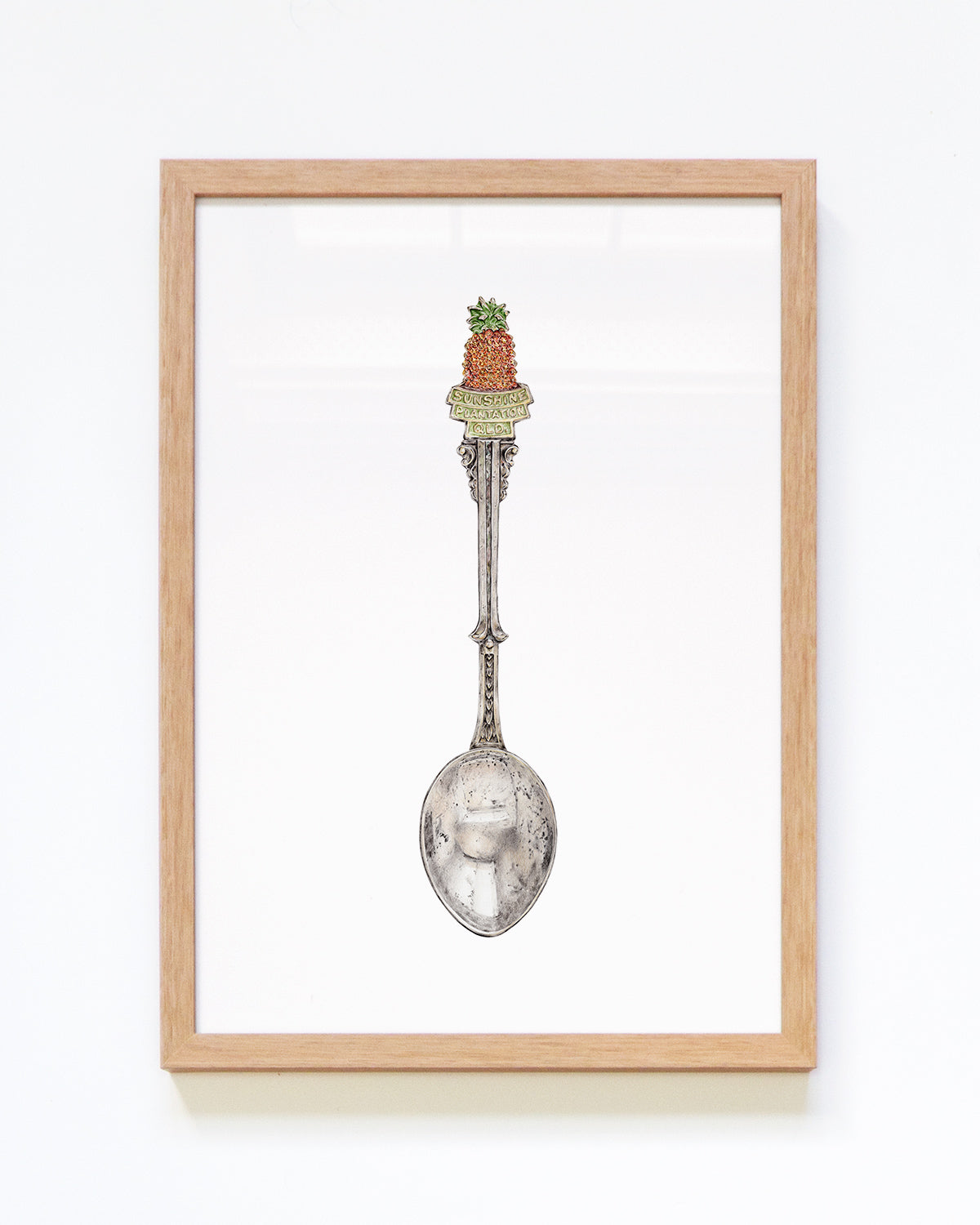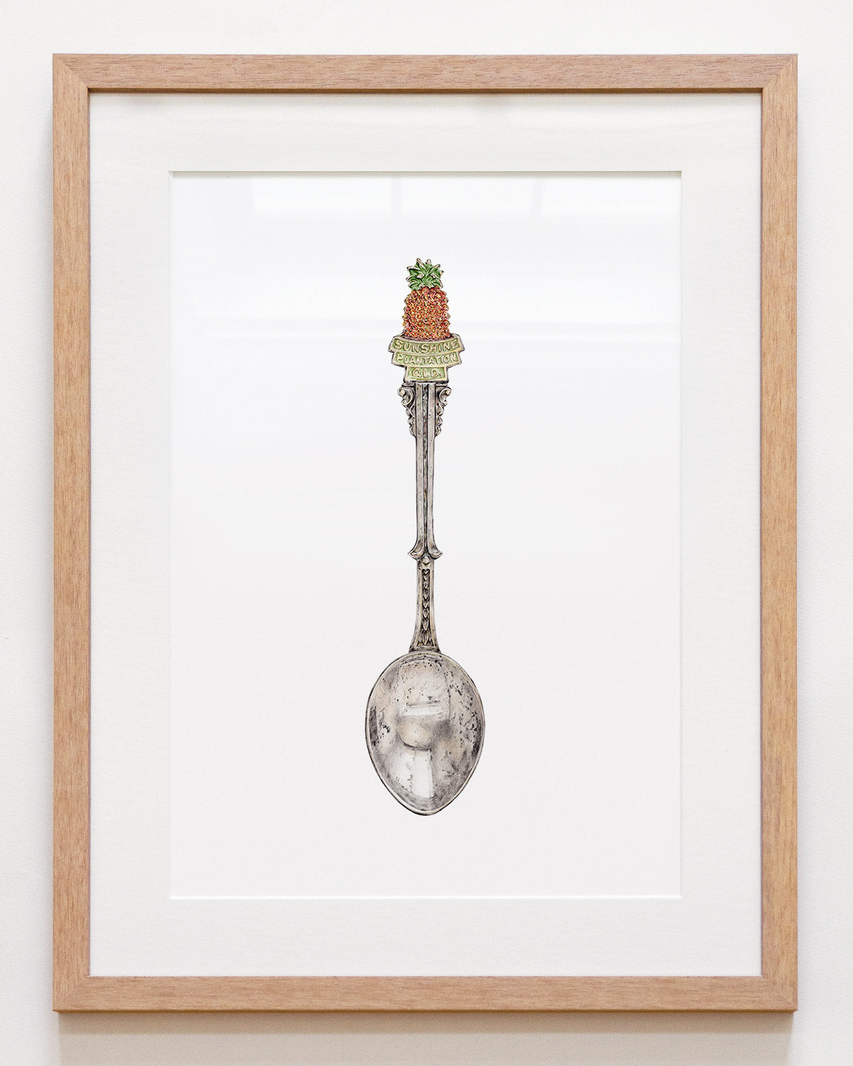 This artwork is a part of my souvenir spoon series. The original drawing is quite large, 76 x 56cm, slightly under A1 in size. To maintain the integrity of the original drawing, I am offering this print exclusively in either A2 or A1 sizes.