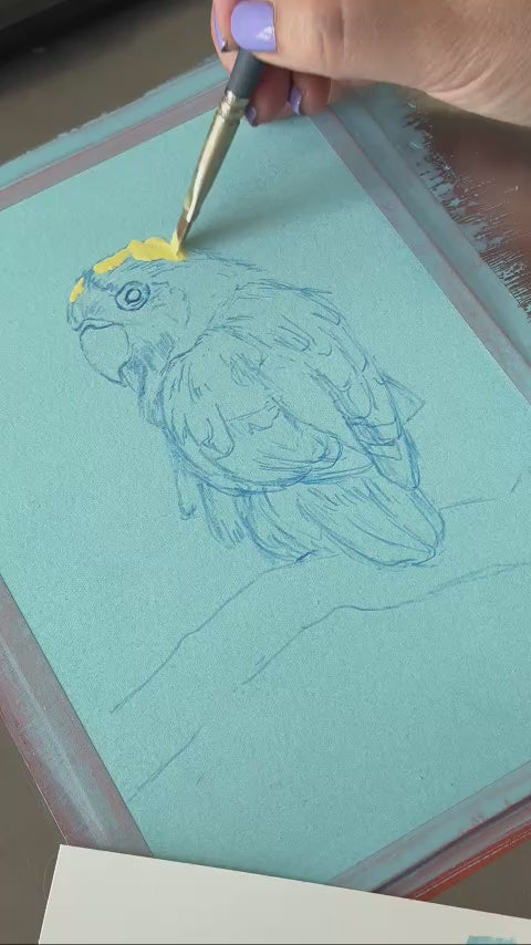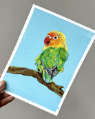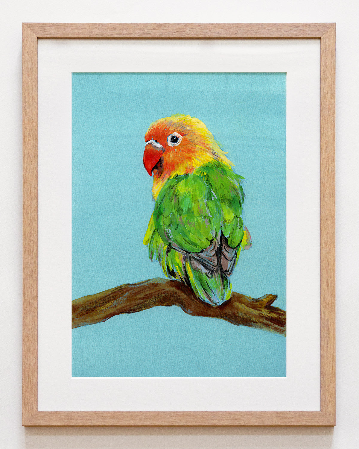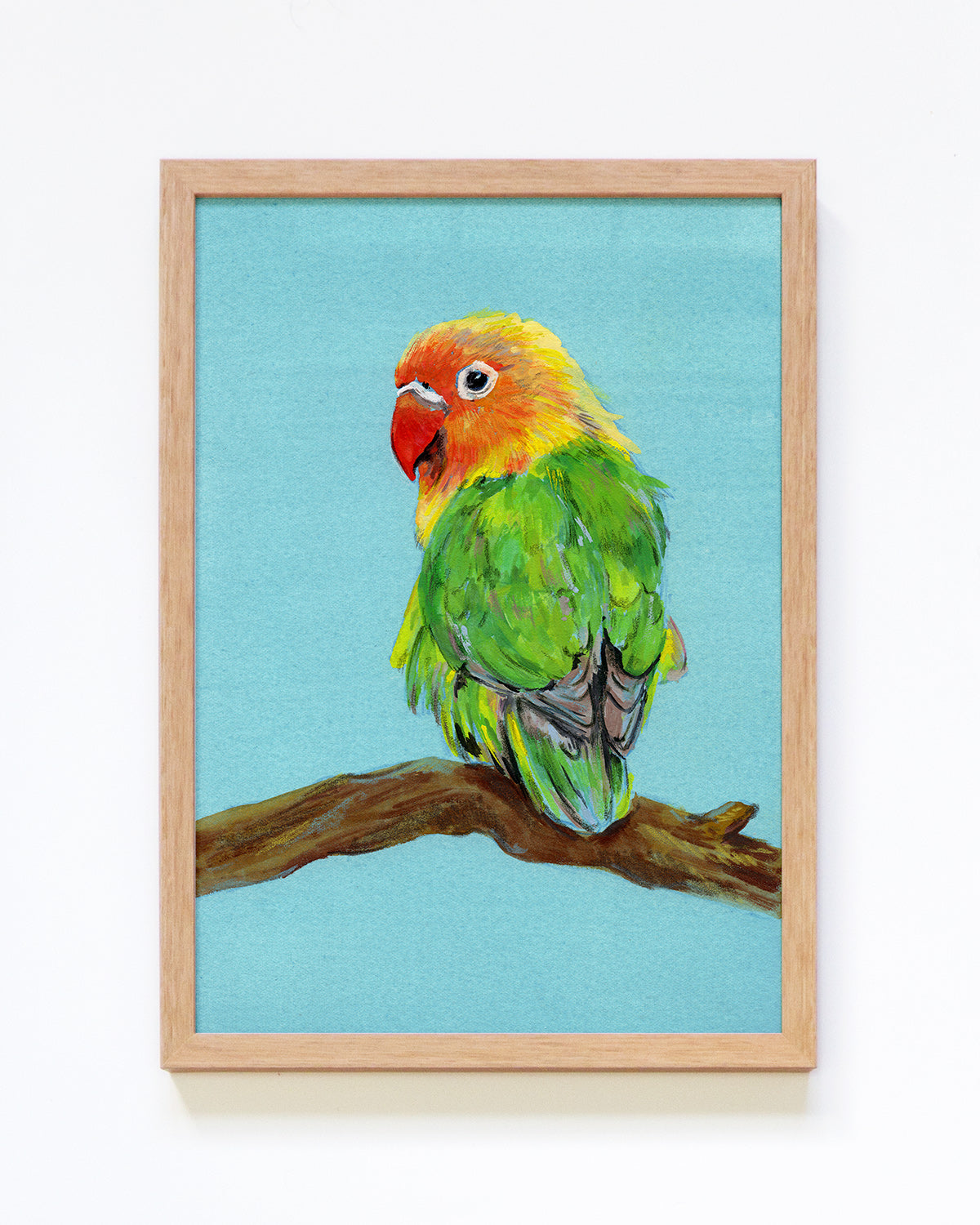 This original gouache and pencil artwork captures Gustav the Lovebird in all his bright, affectionate splendour. Known for his exuberant personality and hopelessly romantic tendencies, Gustav always seems to be mid-conversation, as though he’s composing a heartfelt love letter or rehearsing an emotional ballad about millet seeds.