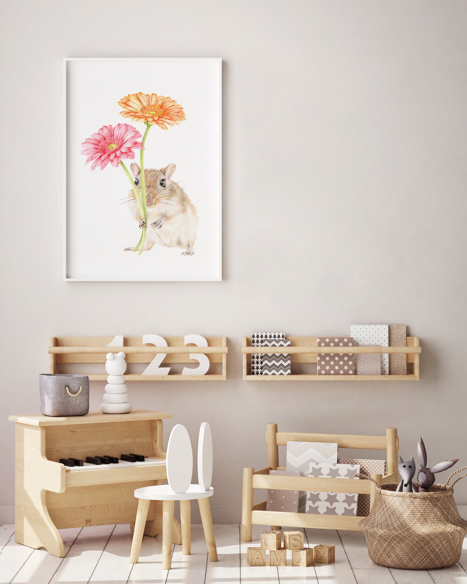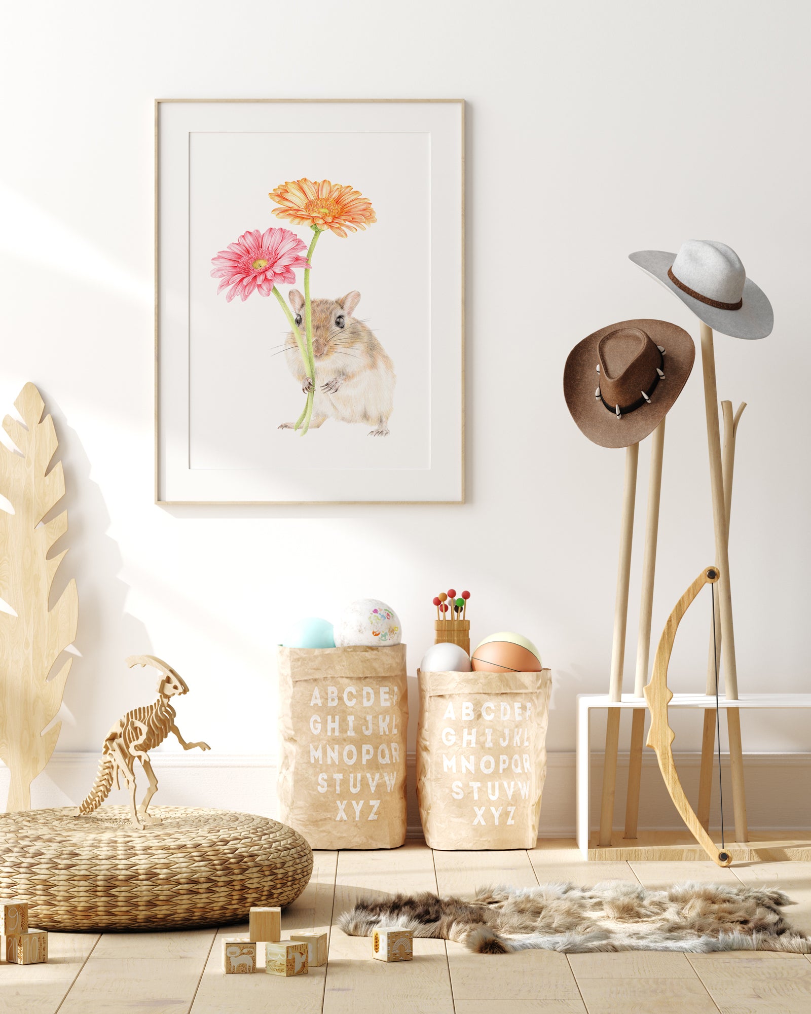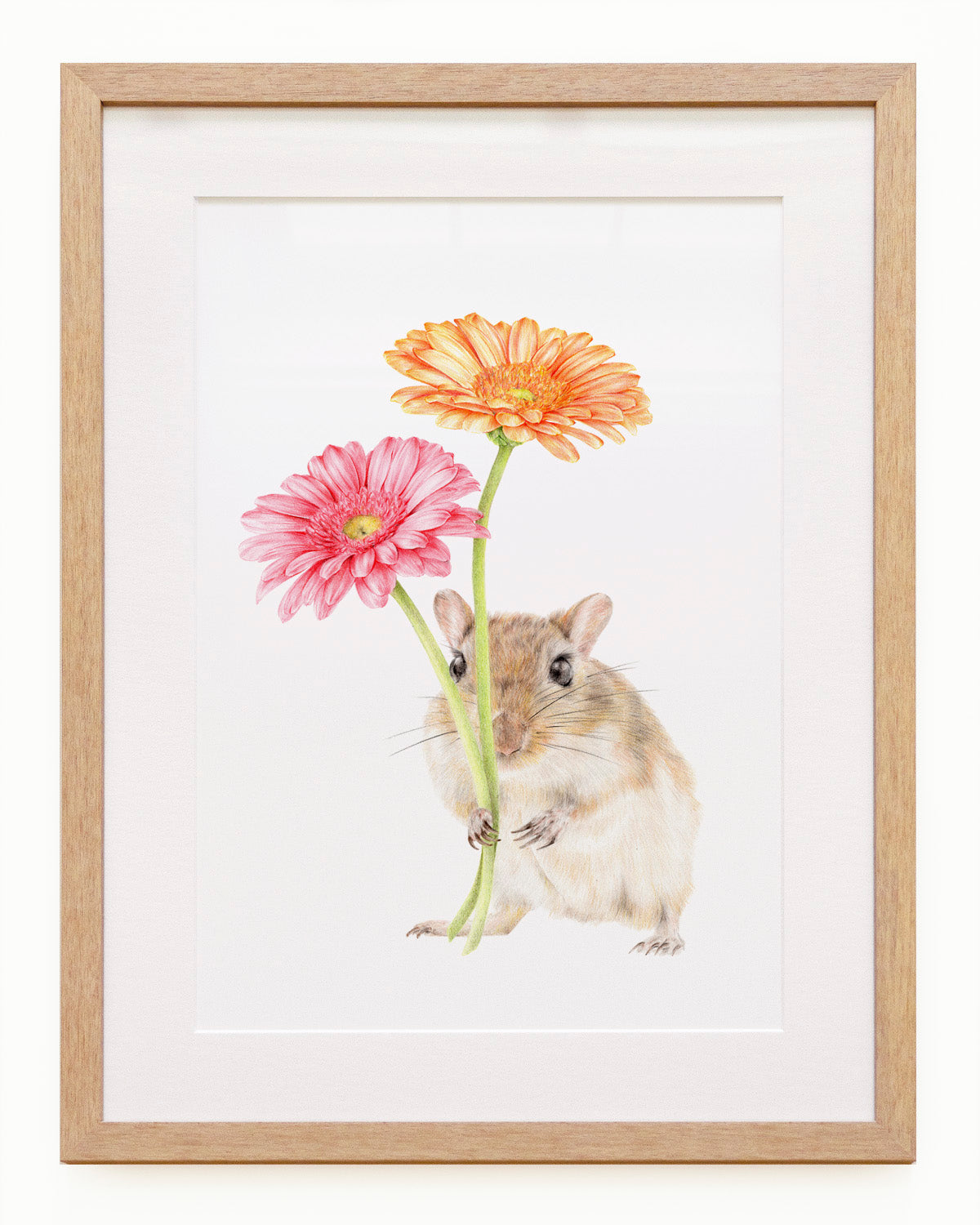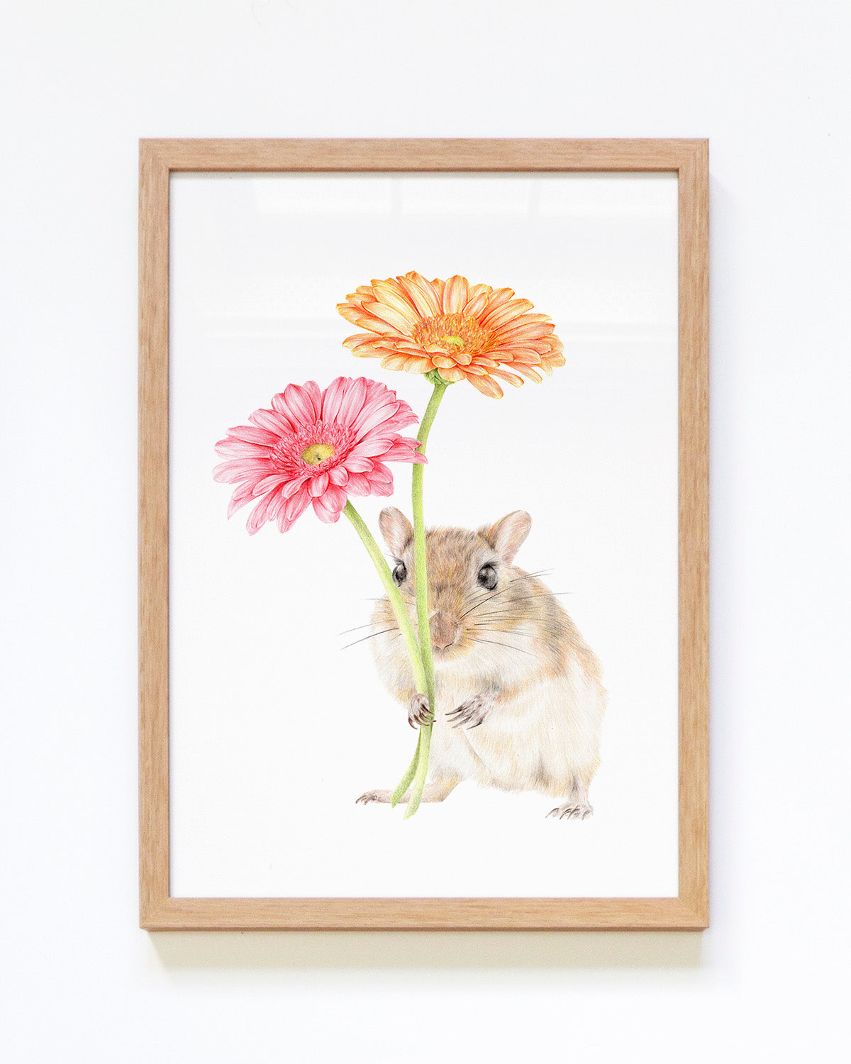Meet Gerald the Gerbil on his way to a dinner party with Gerberas picked from his own backyard. He is a firm believer in the uplifting magic of flowers and is never seen without his favourite Gerbera.