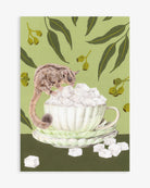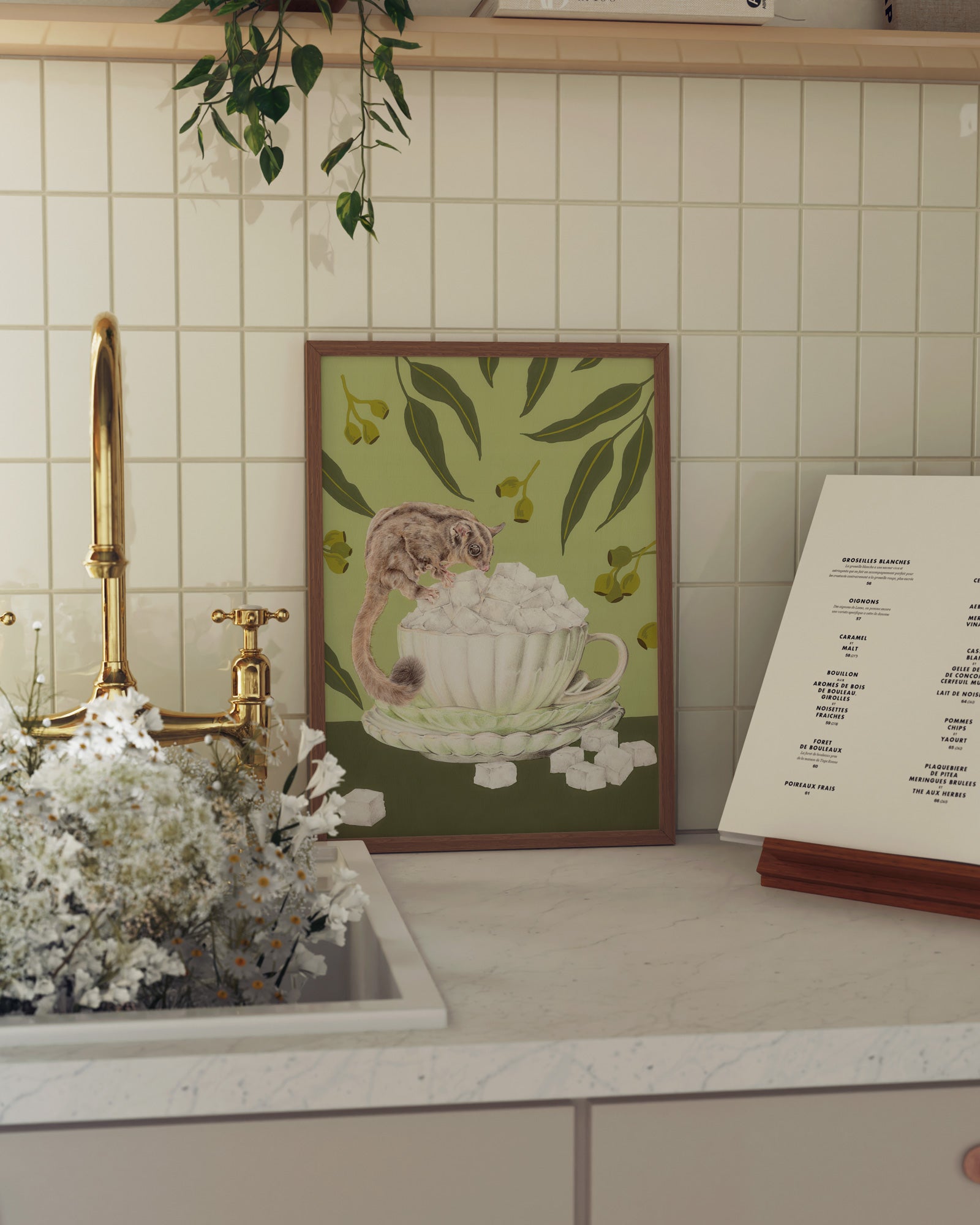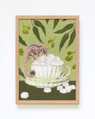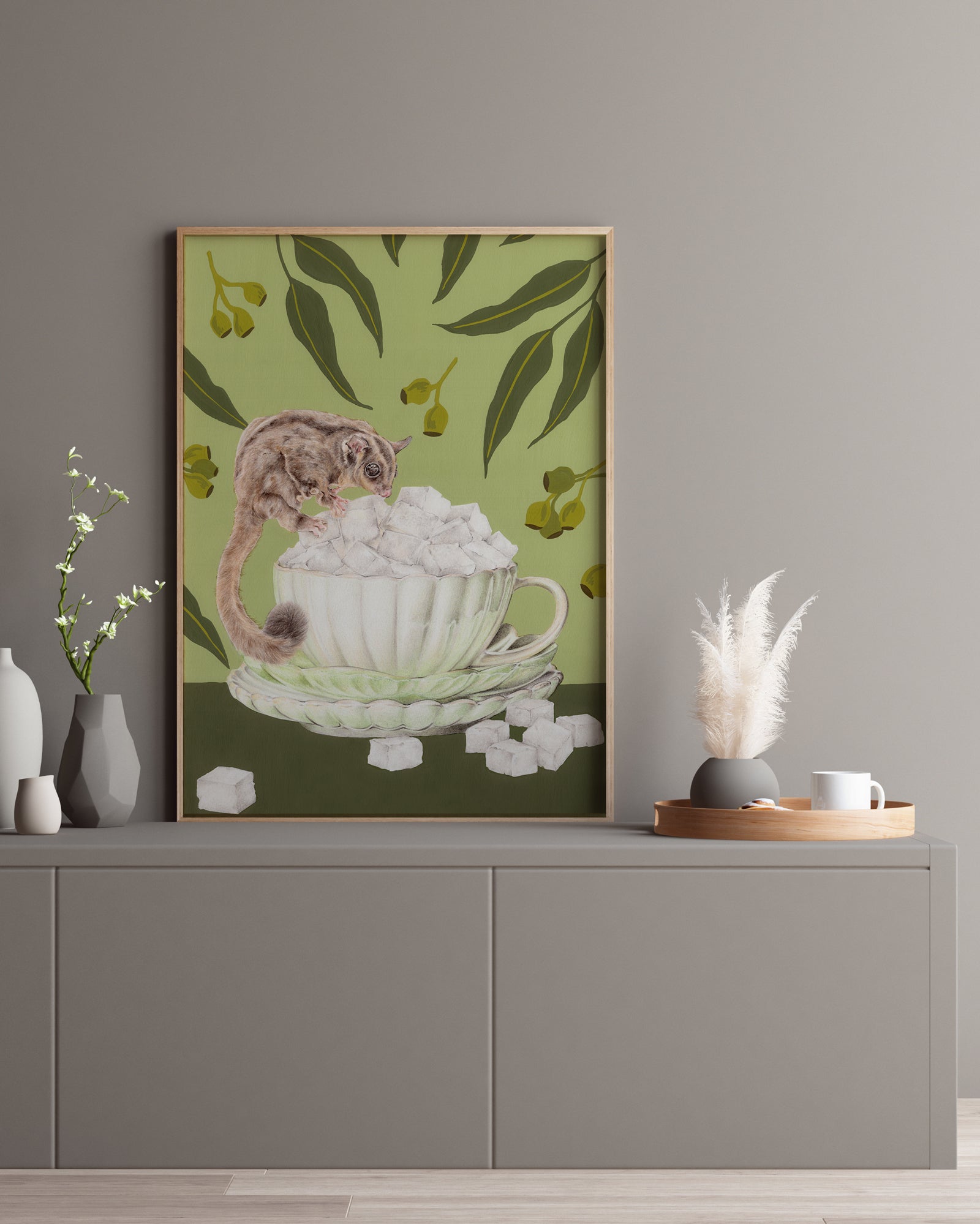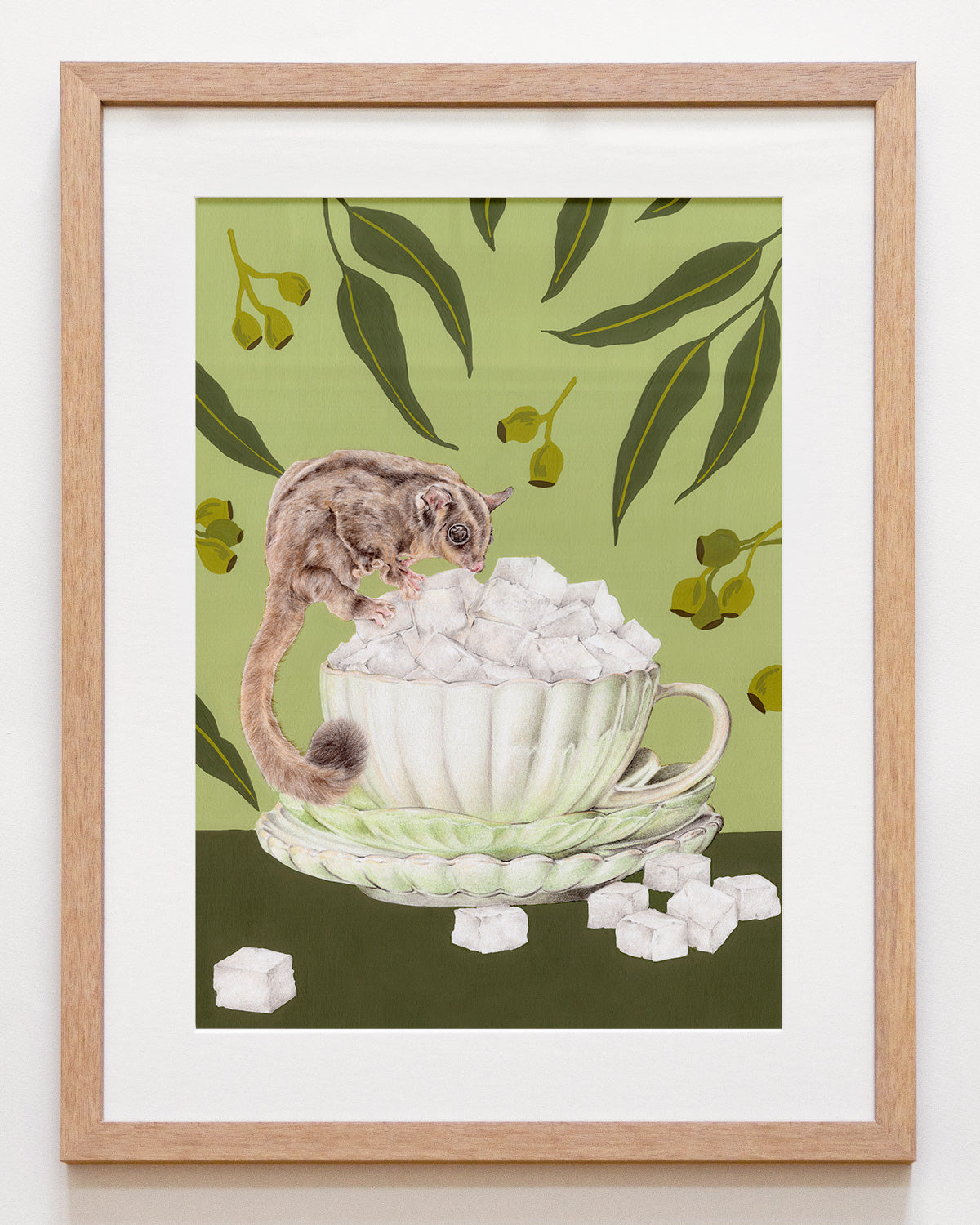 Meet Sugar Sugar, a cheeky little sugar glider who couldn’t resist sneaking into a vintage teacup piled high with sugar cubes. Originally drawn with pencils and finished with gouache, this artwork captures the playful side of one of Australia’s most adored marsupials.