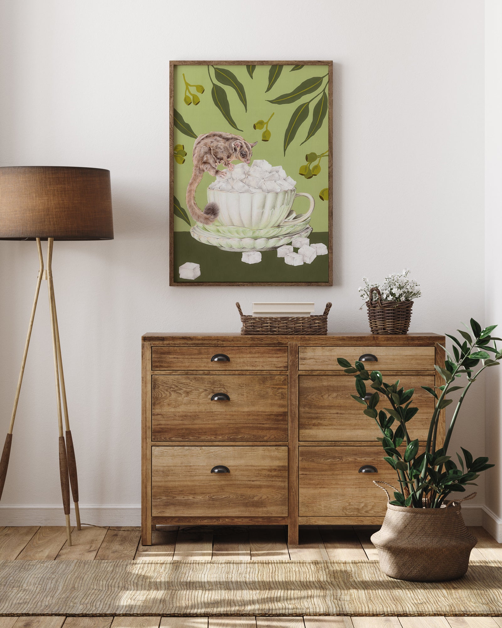 Every detail, from the delicate teacup to the glider’s mischievous paws, has been carefully illustrated to bring a sense of joy and warmth into your home. Whether you’re an animal lover, a tea enthusiast, or simply someone who appreciates art that makes you smile, Sugar Sugar is a piece to treasure.