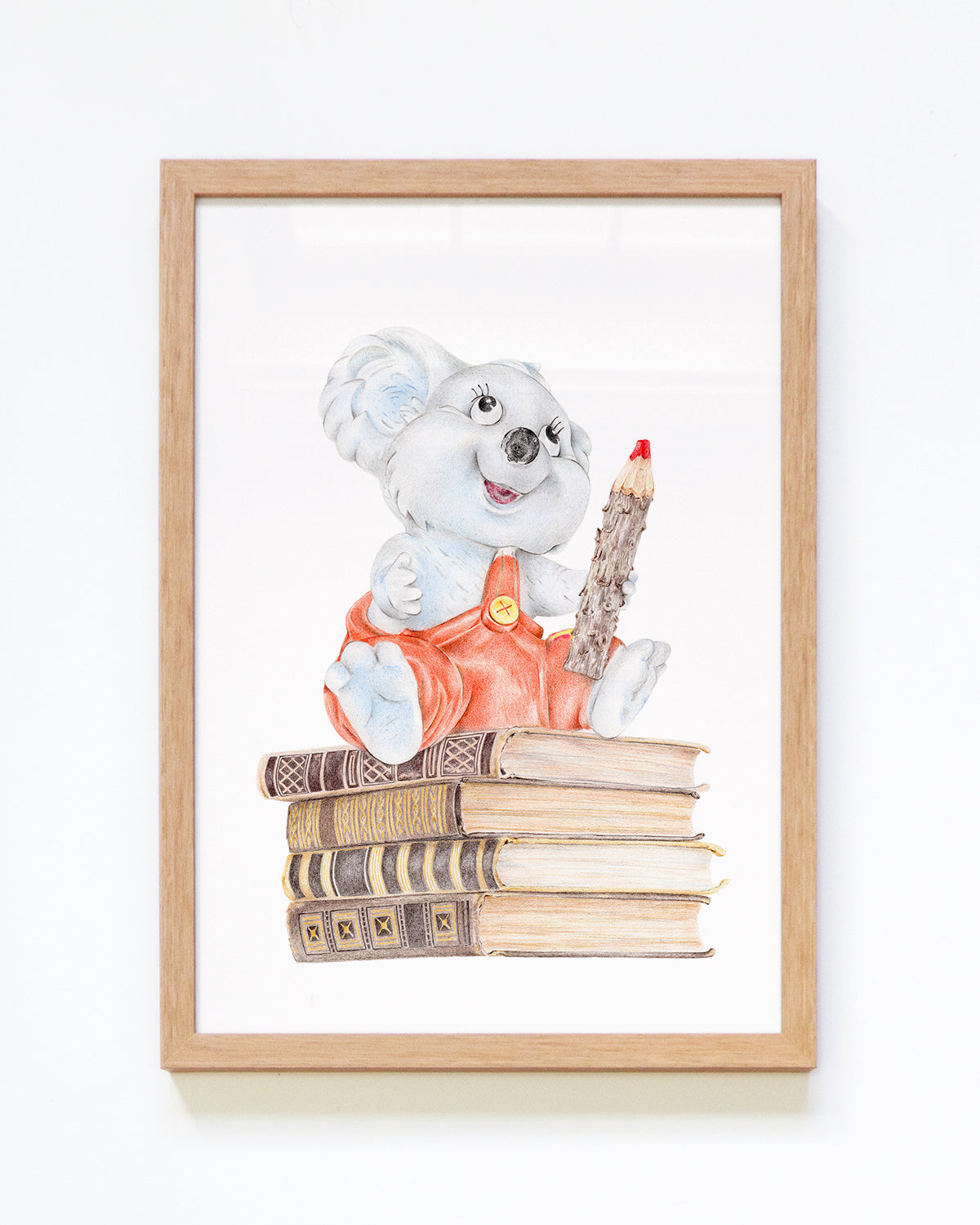 This is an original drawing of a Blinky Bill sitting on a stack of vintage books.