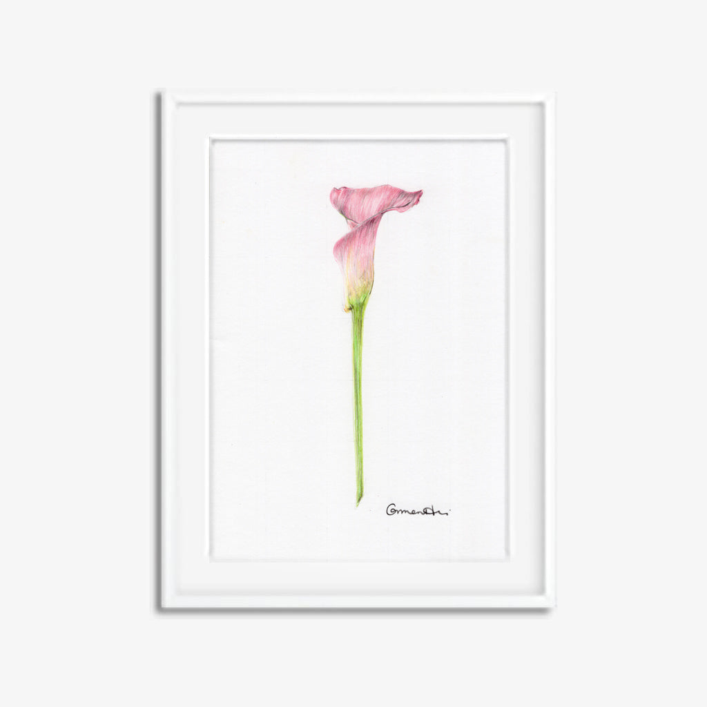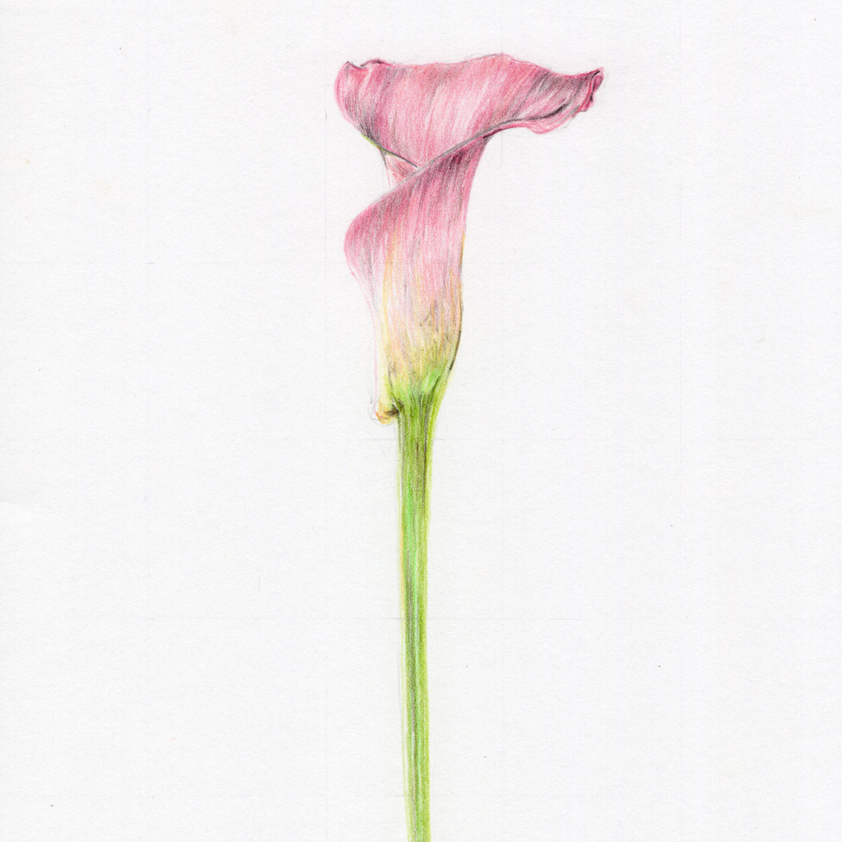 The pink calla lily originates in South America. The calla lily is not actually a lily. The word calla means beautiful in Greek. Pick calla lilies spread joy and youth and are generally known to be used in ceremonies for children. This drawing is from the 100 Days of Flowers projected completed in 2015.