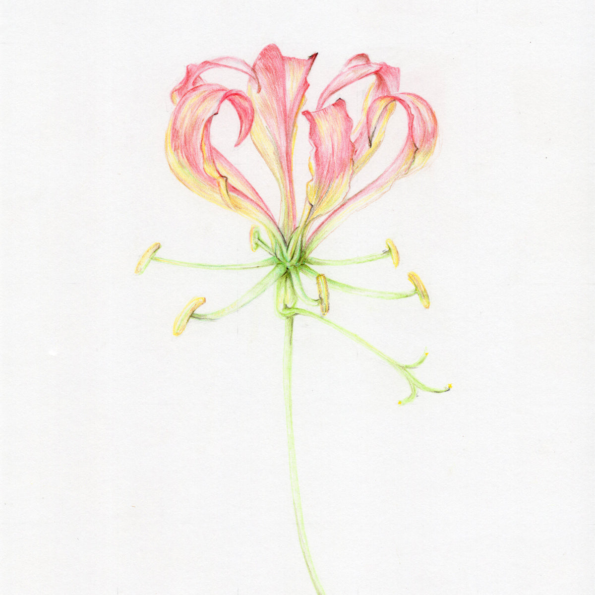 This show-stopping flower is extremely dangerous. Al parts of the plant are extremely poisonous and the ingestion of flame lily has caused many accidental deaths. It has also been used to commit murder, suicide and to induce abortions This drawing is from the 100 Days of Flowers projected completed in 2015.