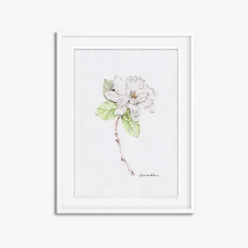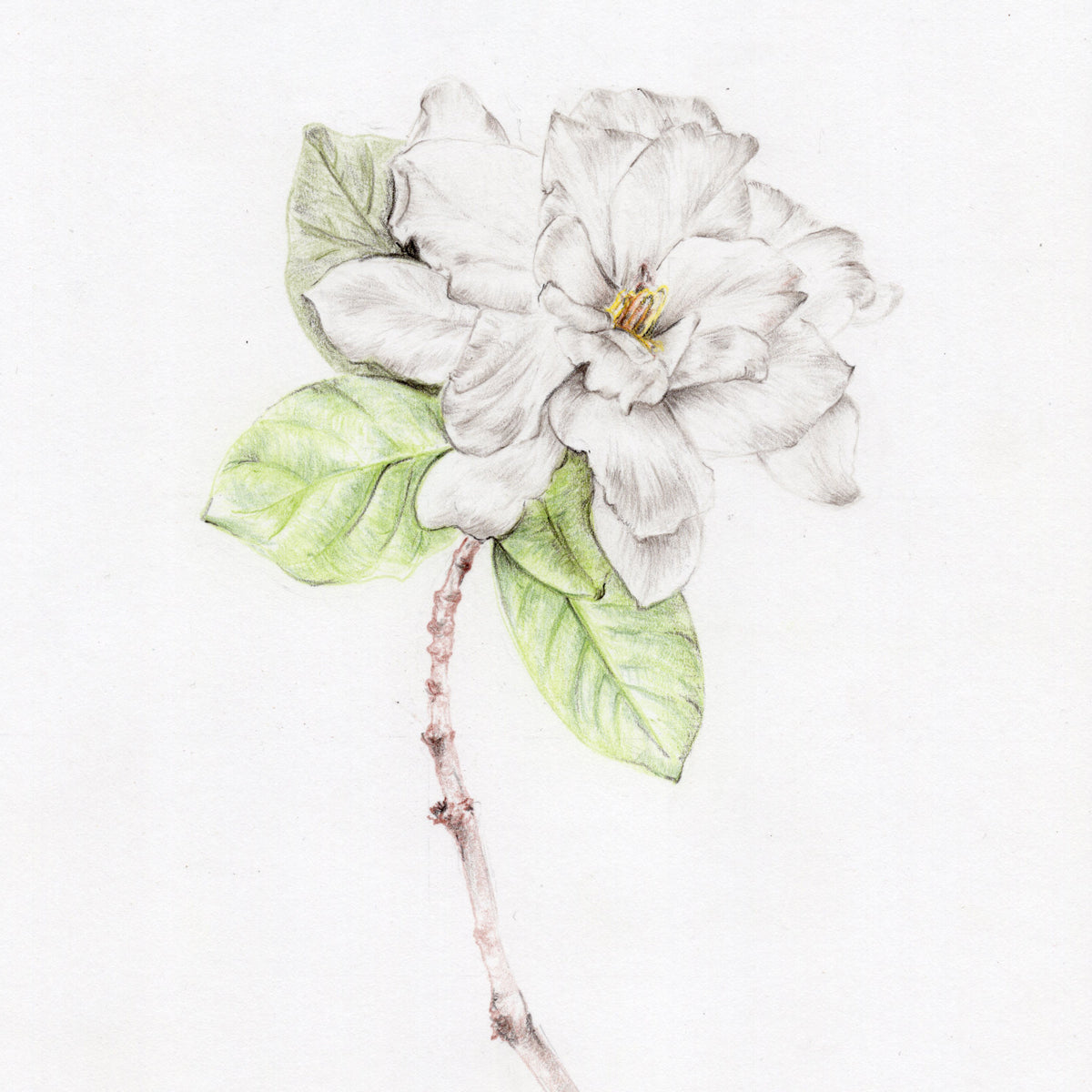 Original pencil drawing of a Gardenia, this drawing is from the 100 Days of Flowers projected completed in 2015.