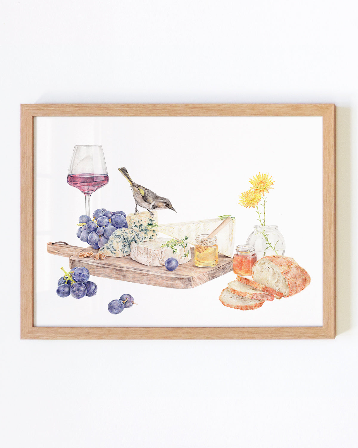 Original pencil drawing of a crescent honeyeater with wine and cheese. Drawn with Faber Castell Polychromos coloured pencils and pastel pencils on 300gsm hot pressed watercolour paper.