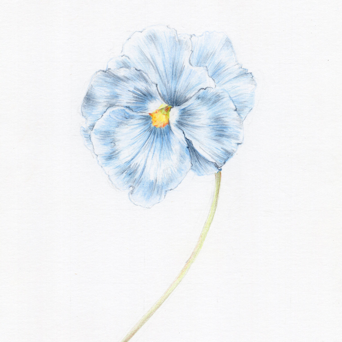 The name pansy is from the French word pensie, meaning our remembrance. Some pansies have a delicate and unforgettable perfume. They seem to exude more fragrance in early morning and dusk. This drawing is from the 100 Days of Flowers projected completed in 2015.
