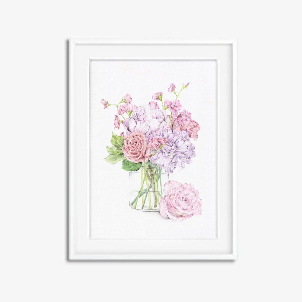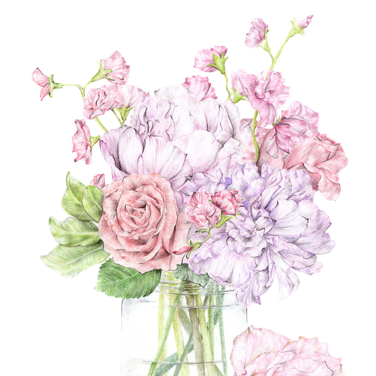 Original pencil drawing of a bouquet of flowers featuring roses, peonies and sweet peas.