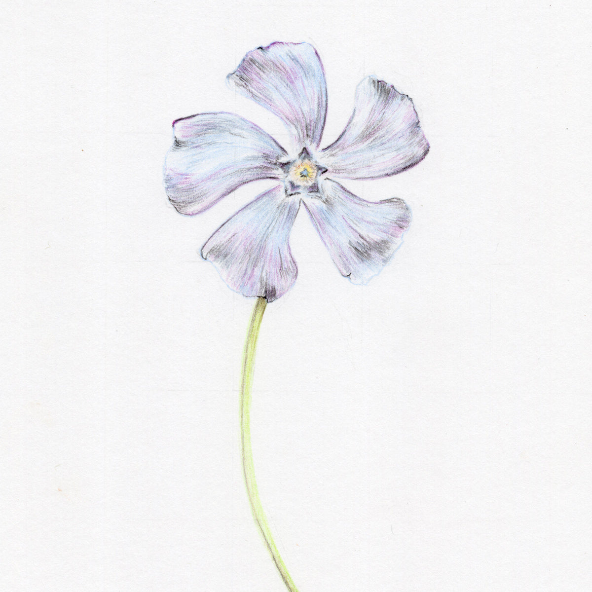 Periwinkle symbolises benevolence, gifts from the heart and chance that delight the spirit. It is a flower that speaks to honour the freedom to be yourself and allow those you love to do the same. This drawing is from the 100 Days of Flowers projected completed in 2015.