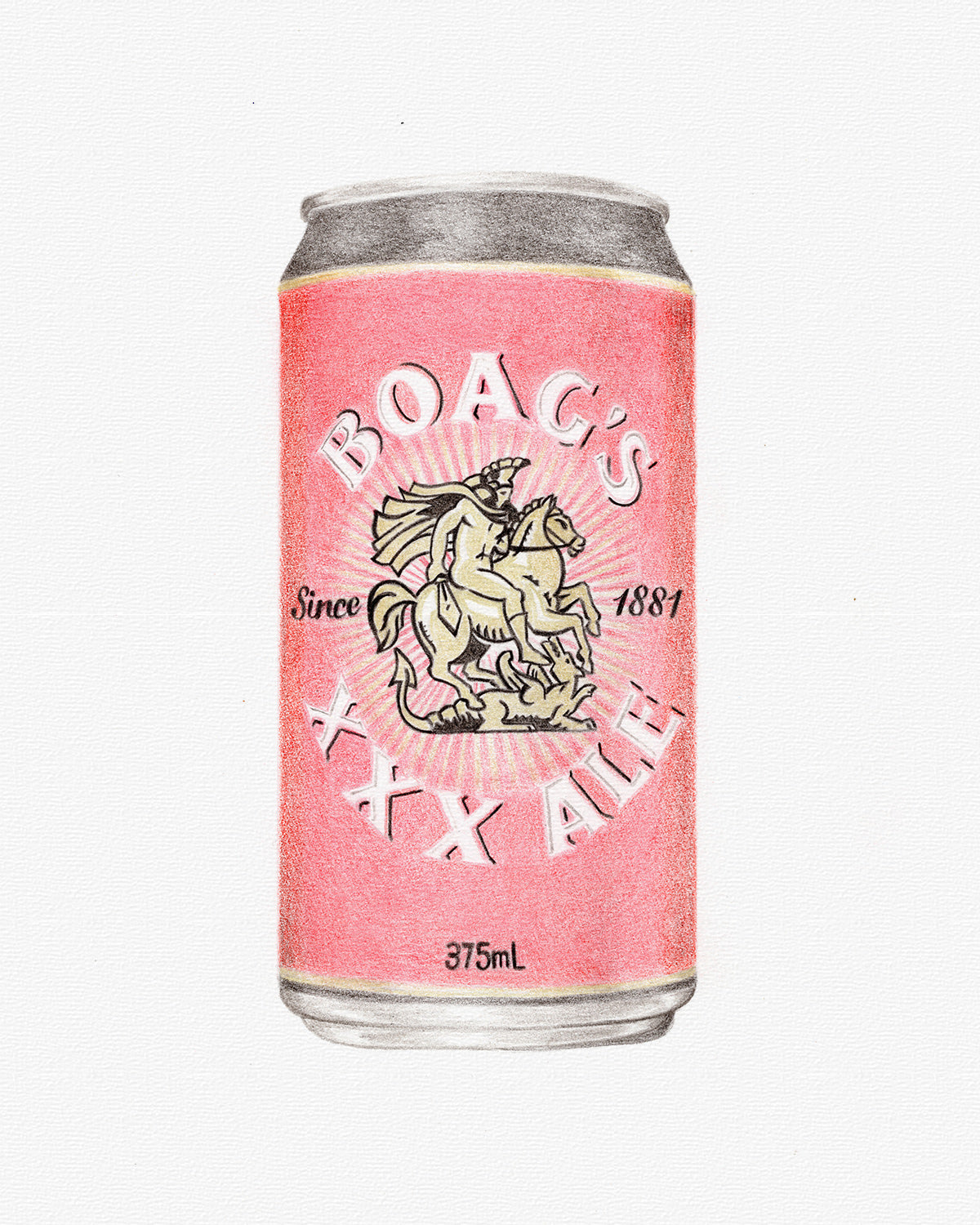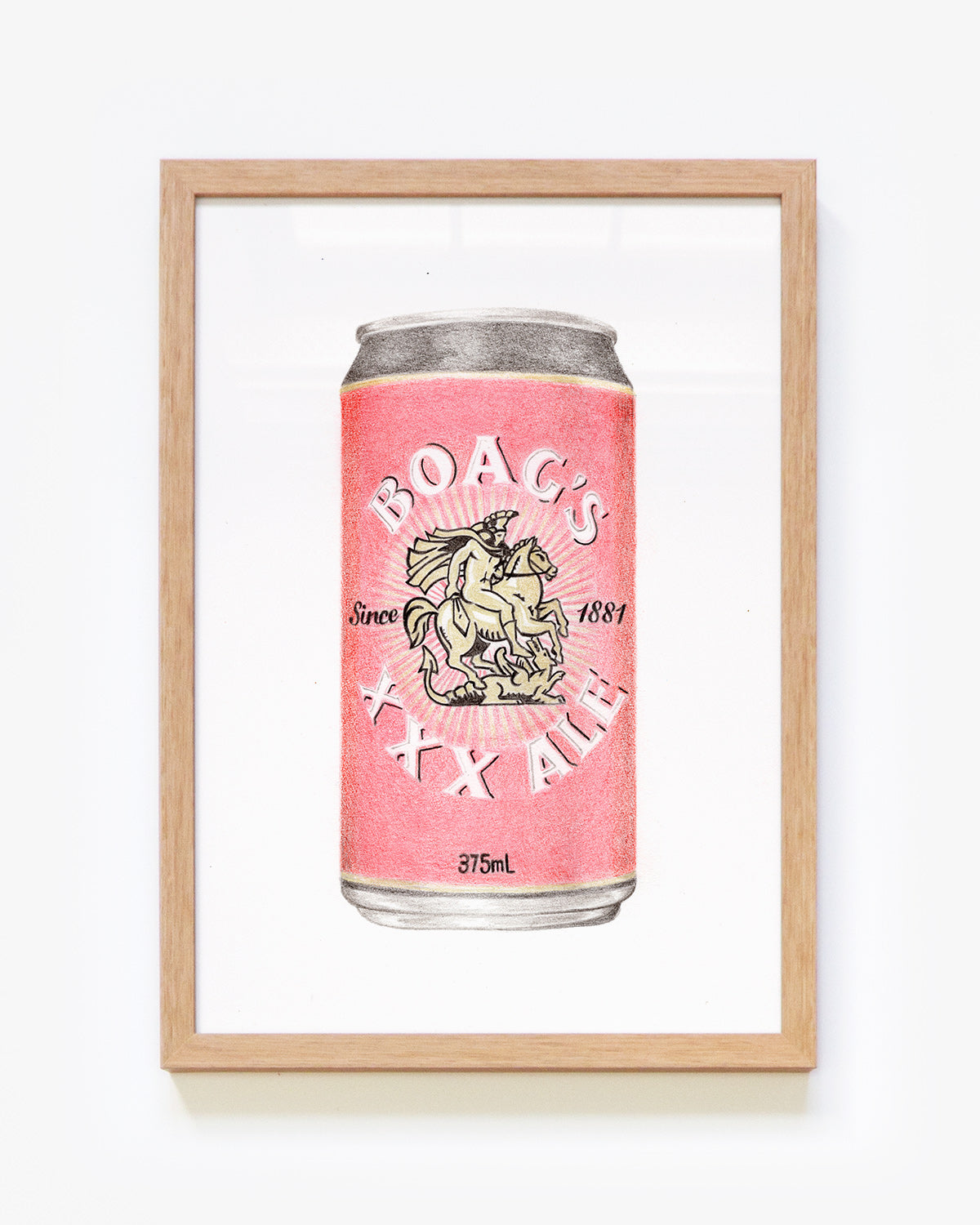 This is an original pencil drawing of a Boag's XXX Ale beer can. Created with Faber Castell Polychromos coloured pencils on 300gsm hot pressed watercolour paper. Drawn in 2022.