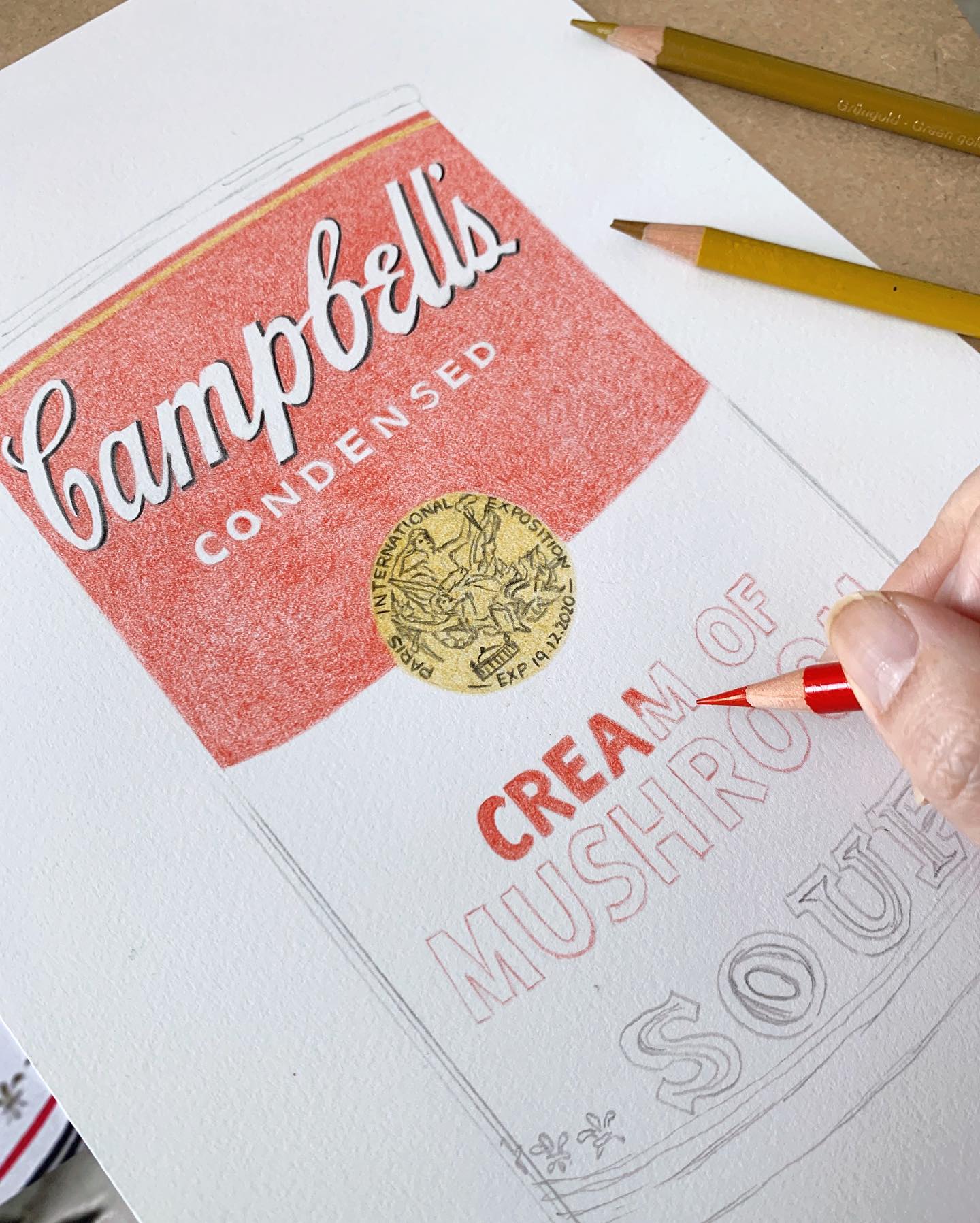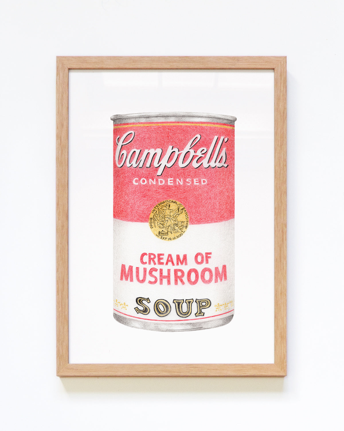 Original pencil drawing of a vintage Campbell's Cream of Mushroom can. Drawn with Faber Castell Polychromos coloured pencils on 300gsm hot pressed watercolour paper.