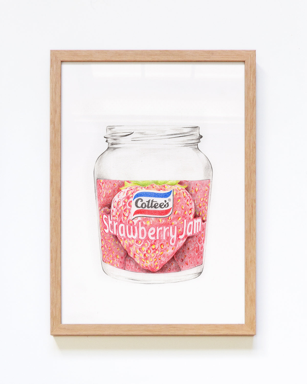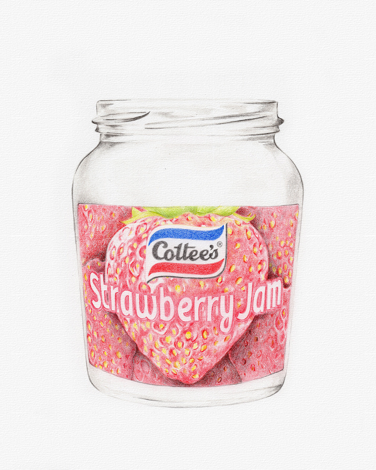 Original pencil drawing of a Cottee's Strawberry Jam jar. Drawn with Faber Castell Polychromos coloured pencils on 300gsm hot pressed watercolour paper.