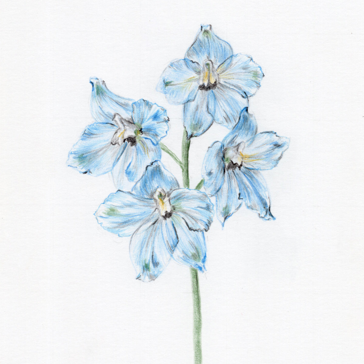 The name delphinium is from the word meaning dolphin in Latin, named due to to the plant's bud and spur that resembles the shape of a dolphin. This drawing is from the 100 Days of Flowers projected completed in 2015.