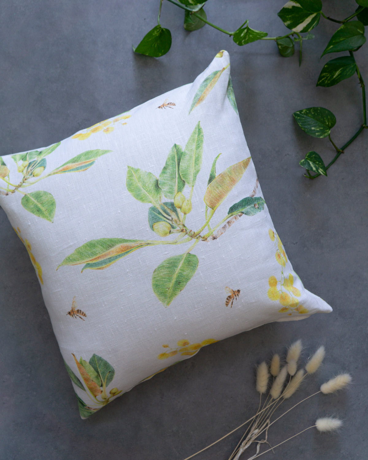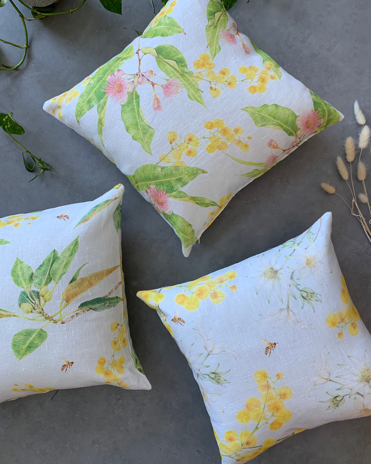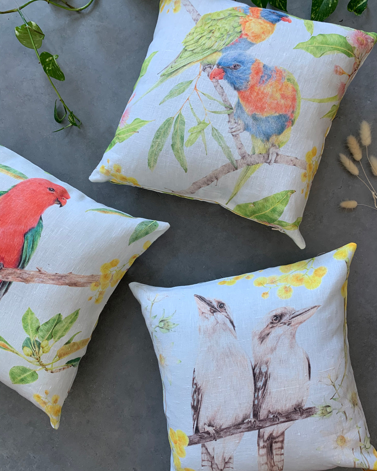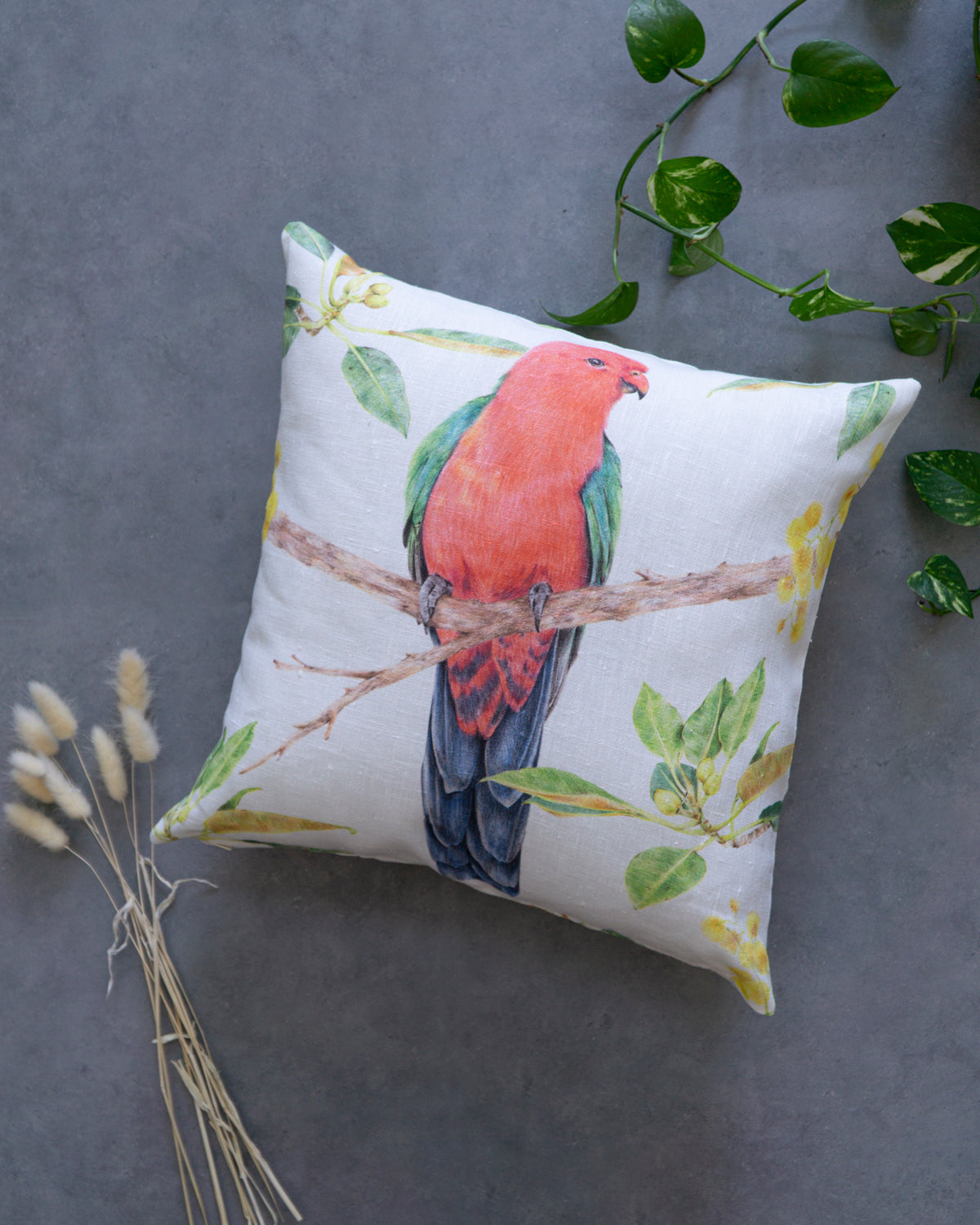 The front of the cushion features a king parrot with native florals and the back has a native botanical pattern.