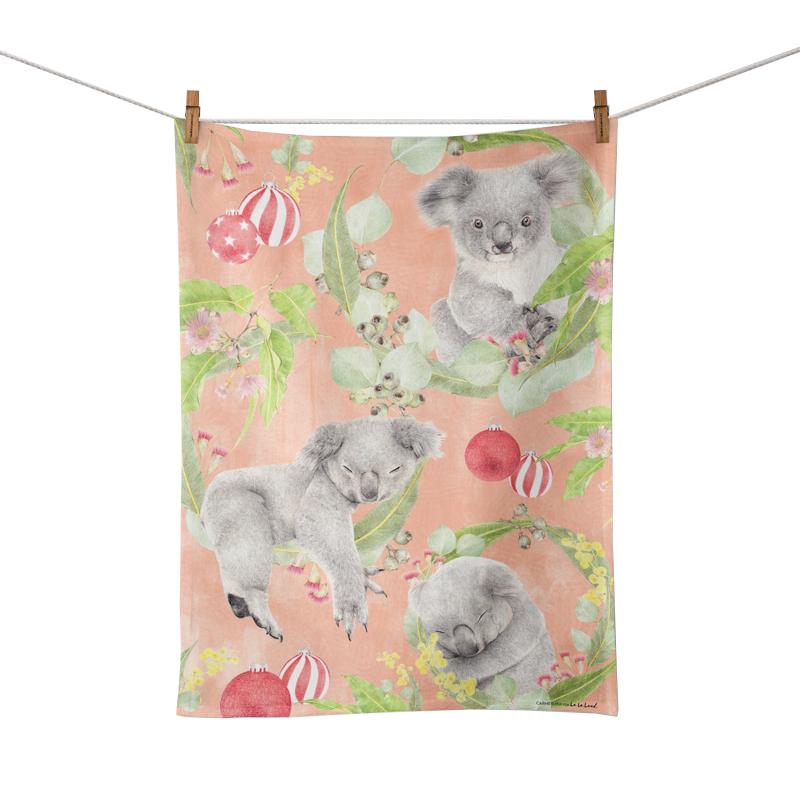 Illustrated tea towel featuring a series of darling koalas with Christmas baubles. A sweet addition to the perfect Christmas lunch.