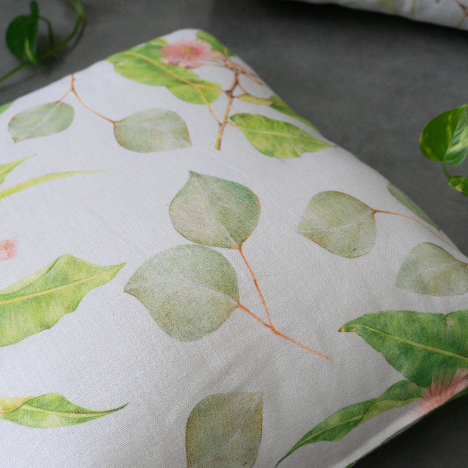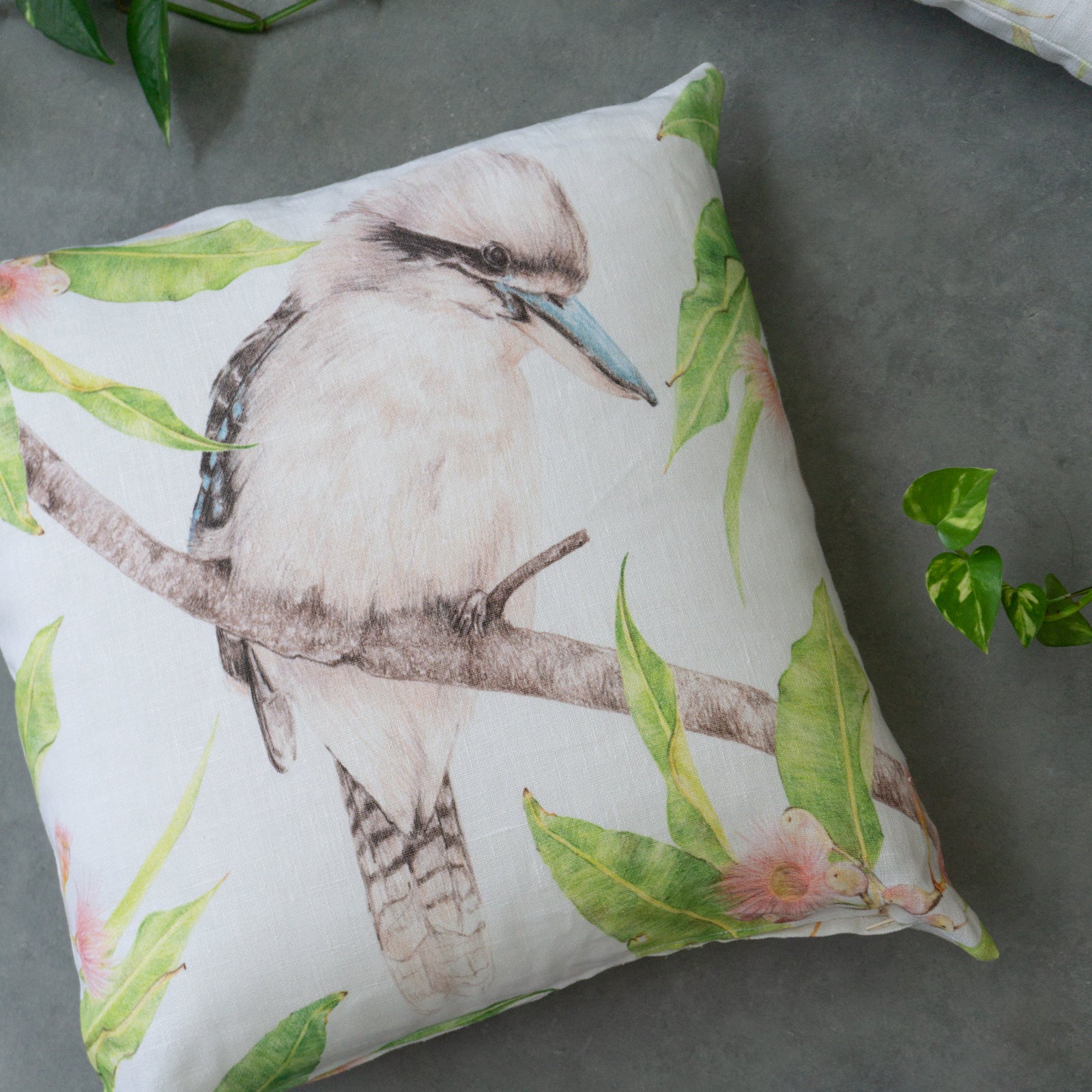 The front of the cushion features a native kookaburra and the back has a botanical pattern made out of red flowering gums and gum leaves.