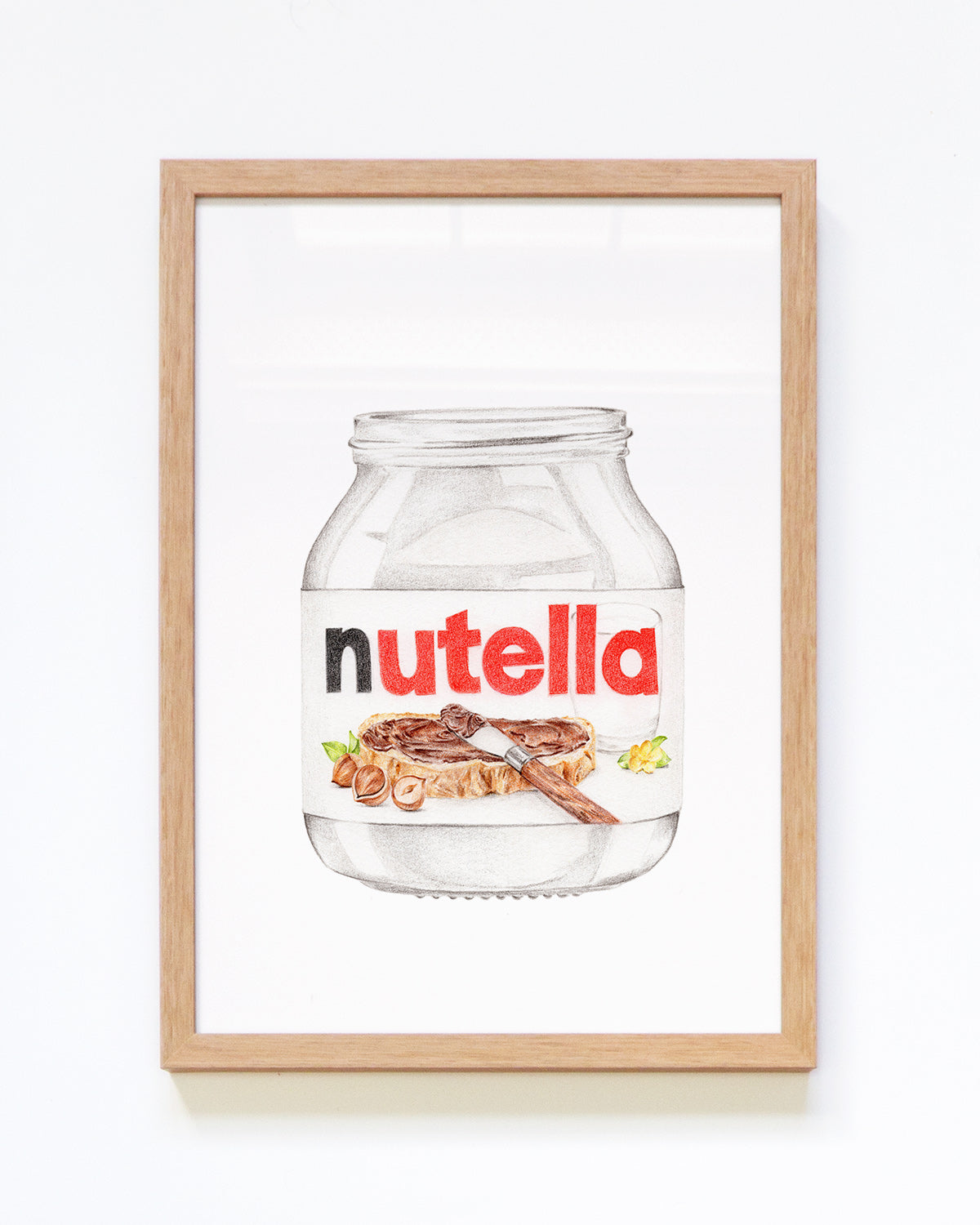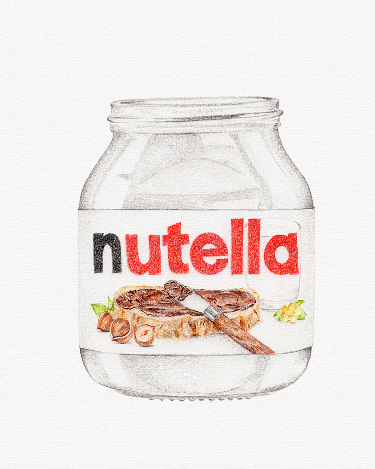 Original pencil drawing of a Nutella jar. Drawn with Faber Castell Polychromos coloured pencils on 300gsm hot pressed watercolour paper.