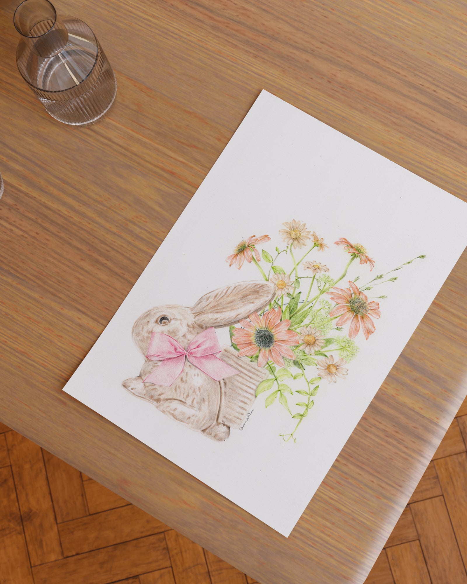Pencil drawing of a spring bouquet in a vintage bunny vase. Bouquet features Comos, daisies and Queen Anne's Lace. Drawn on 300gsm hot pressed watwercolour paper.